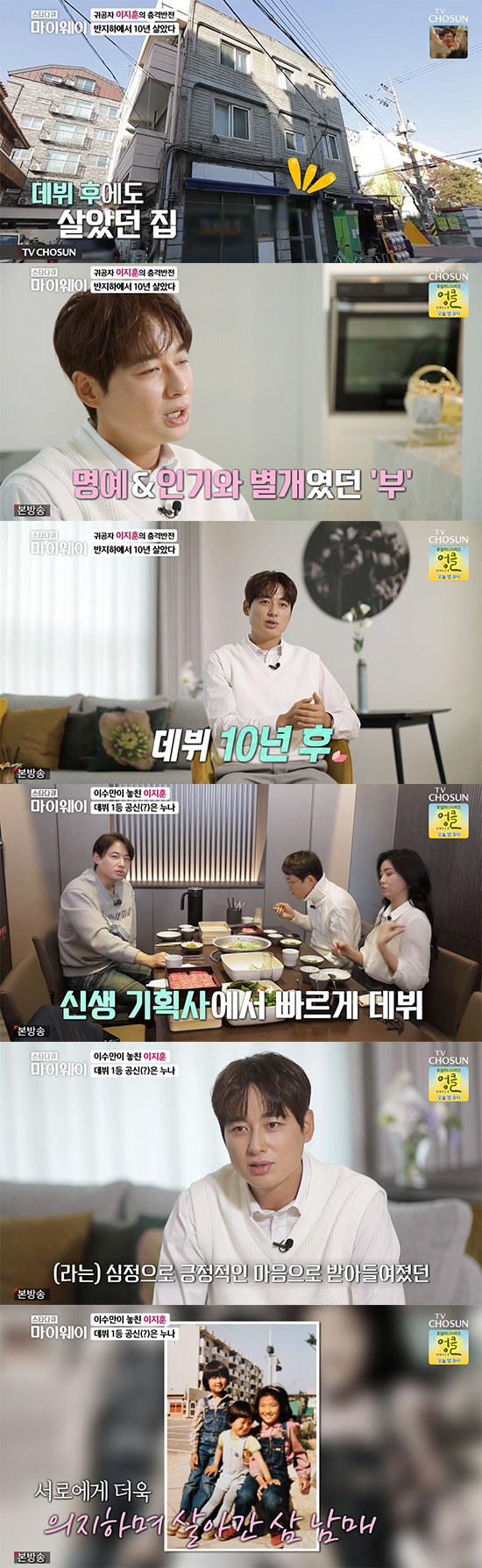 이지훈의 삼남매는 데뷔 후에도 살았던 예전 동네를 찾았다. "아버지 사업이 어려워져서 반지하 방에서 10년을 살고, 학교 앞 상가 건물에 살았다. 데뷔 후에도 차에서 내려서 사람이 있나 없나 살피고 탔다"고 회상했다. "어려운 시절이 있어서 동기 부여가 됐다. 연예계 생활이 쉽지 않은데, 그런 곳에서 좀 묵묵하게 버틸 수 있었던 힘도 힘든 생활을 겪었기 때문에 견디지 않았을까 생각한다"고 덧붙였다.
