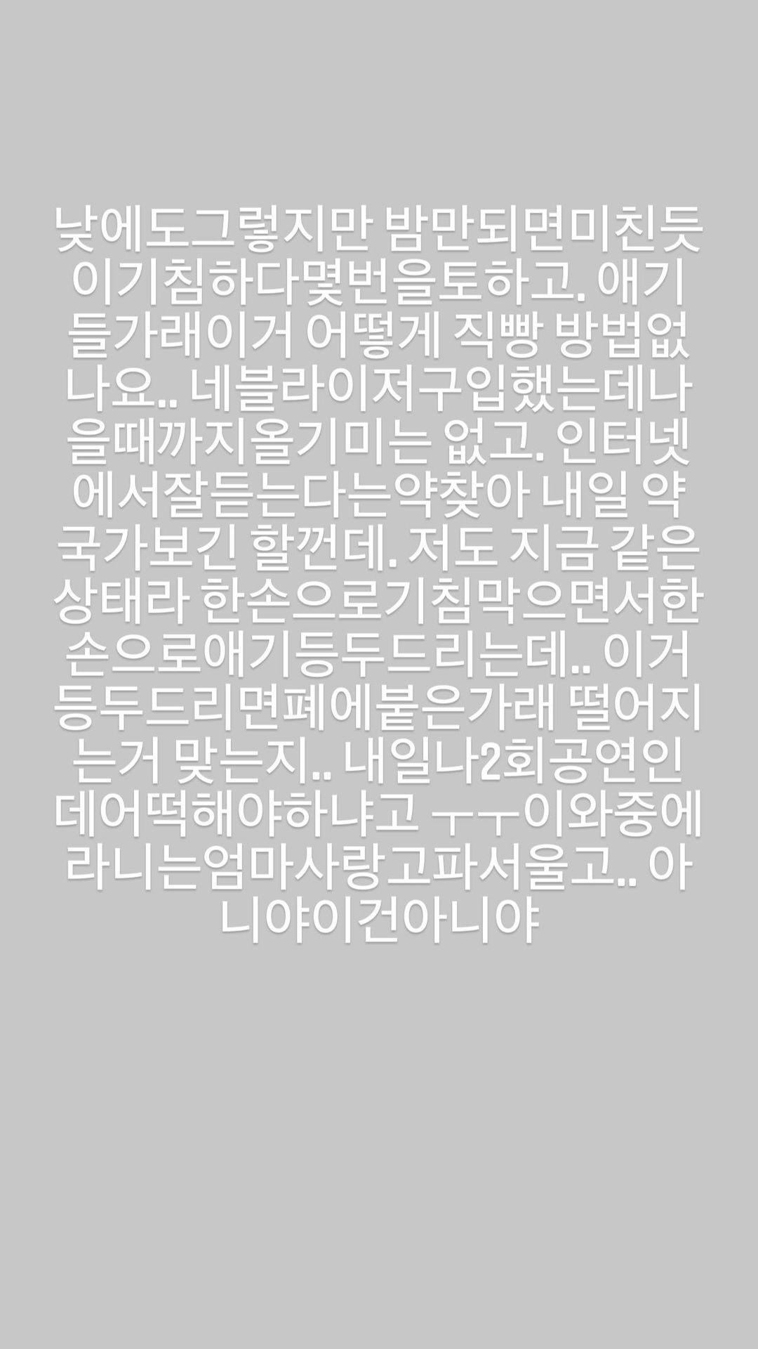 앞서 이윤지는 딸 소울 양의 사진과 함께 "아플 때만 나오는 쌍꺼풀"이라고 언급했던 바. 감기에 걸렸는지 밤마다 아파하는 소울 양의 근황이 안타까움을 자아낸다. 더구나 이윤지까지 함께 기침으로 힘들어해 팬들의 걱정을 더했다.