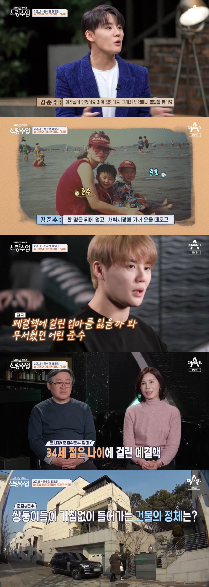 김준수는 "제가 원래부터 잘 사는 줄 아시는데 어렸을 때 반지하에 살았다. 화장실도 없어서 부엌에서 볼일을 봤다. 외할머니, 큰이모댁에서 살기도 했다. 어렸을 때부터 우리 형제가 잘되면 좋은 집에서 살고 싶다는 이야기를 많이 했다. (성공한 후) 부모님께 집을 선물했다"라고 부연했다.