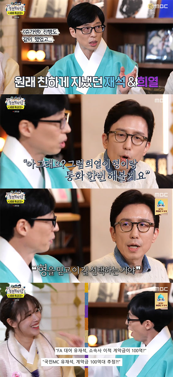 그런가 하면, 하하와의 비하인드도 전했다. 유재석은 "미주와 안테나와 잘 이야기가 마무리 됐는데, 그날 밤 12시에 하하한테 전화가 왔다"면서 "형한테 드릴말씀이 있다. 회사 식구들과 오래 얘기하고 말씀드리는건데 나 미주 우리 회사에 대려오고 싶다. 형 나 돈있어요"라고 했다고. 이를 몰랐던 미주는 감동했다. 유희열은 "인연이라는게 타이밍이다. 연애과정 같다"고 덧붙였다.