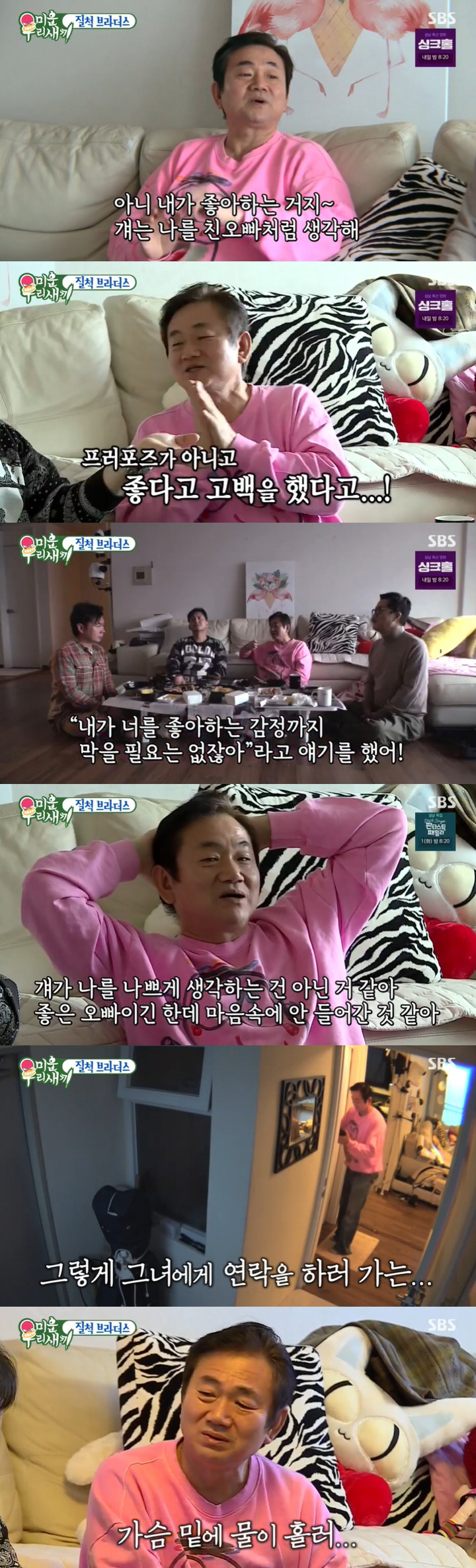 배도환은 "걔는 나를 30년 동안 오빠로 밖에 생각 안 했다. 근데 어제 내가 좋아한다고 처음으로 말했다"며 "'어머니가 하도 결혼하라고 하셔서 올해는 결혼할 거라고 말씀드렸다. 그러니까 잔소리는 하지 말아 달라고 했다. 그래서 올해는 내가 결혼을 해야 될 거 같다. 이제 살면 얼마나 살겠냐'고 했다"며 고백한 사실을 털어놨다. 이어 "반응이 나쁘지는 않았는데 '난 오빠로 밖에 생각이 안 든다. 그런 얘기 하지 마'라고 하더라. 그래서 내가 '좋아한다는 말도 못 하냐. 내가 널 좋아하는 감정까지 네가 막을 필요는 없지 않냐'고 했더니 웃었다"고 전했다. 또한 '난 너만 보인다'는 의미를 담은 선글라스까지 선물했다고.
