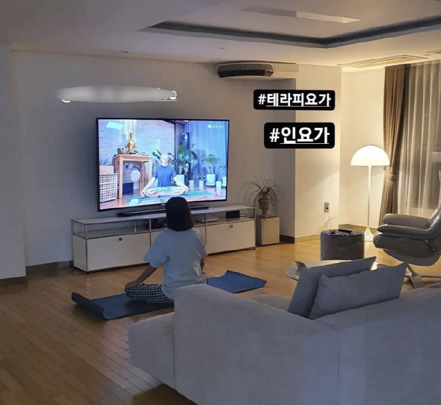 사진 속에는 잠들기 전, 요가로 하루를 마무리 중인 김지혜의 모습이 담겨있다. 휴대폰 속 강의를 보며 요가 동작을 따라하고 있는 김지혜. 새벽 시간임에도 빼놓지 않고 요가 중인 모습이 인상적이다.