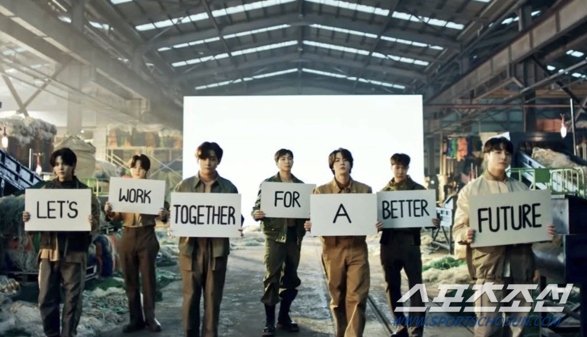 방탄소년단는 이날 온라인 언팩행사의 마지막 장면에 공개된 캠페인 광고에서 '지속가능한 미래'의 필요성을 알리는 문구가 담긴 플래카드를 드는 모습 등을 보여줬다.