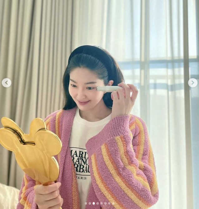 사진에는 화장을 하기 전 스킨케어를 하고 있는 류이서의 모습이 담겼다.