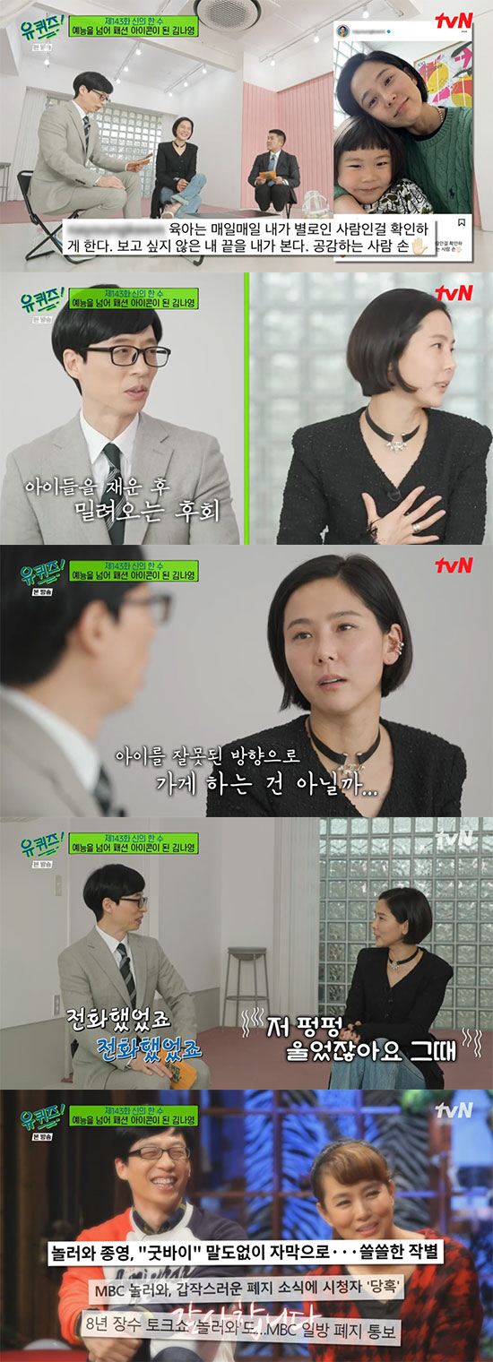 특히 이날 김나영은 자신의 스타일에 대해 "'유퀴즈' 나간다고 하니까 원래 협찬을 잘 안해주는 하이앤드 브랜드인데 해주셨다"면서 "오늘 뻗쳐 입고 나왔다"고 자랑해 눈길을 끌었다.