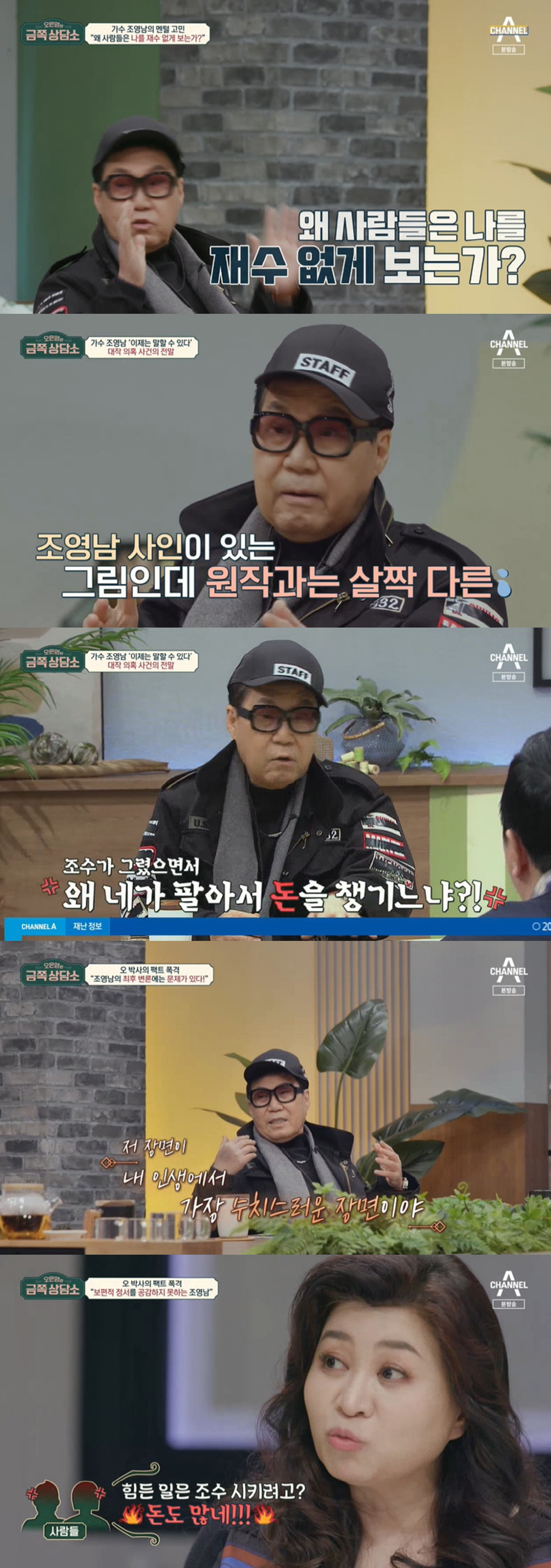 먼저 아카데미 수상 발언에 대해 조영남은 "어느날 기자한테 '윤여정이 아카데미 여우주연상을 수상했다'는 연락이 왔다. 그래서 멋있게 대답했다. '바람 피운 남자에 대한 우아한 복수'라고 했다. 그 말 때문에 거의 죽을 뻔했다. 전시회가 중단 될 정도였다"고 밝혔다. '친일 논란'으로는 KBS '체험 삶의 현장'에서 하차할 정도로 뭇매를 맞기도 했다. 오랜 싸움 끝 무죄를 받은 그림 대작 논란에 대해서는 "화투를 잘라서 콜라주처럼 만든 작품이 있다. 처음할 때는 진짜 화투를 잘라 붙였는데 사람들이 이걸 좋아하니까 조수한테 똑같이 그리라 했다. 내 사인이 있는 그림인데 원작과는 살짝 다르다고 검찰에서는 대작이라더라"라며 "바쁜 화가들은 조수를 다 쓴다. 대법원에서도 조수를 써도 된다고 했다"고 억울해했다.