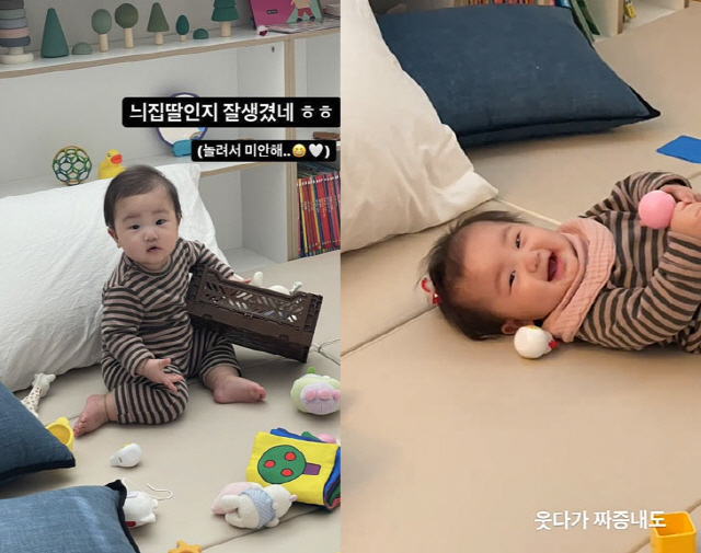 또한 엄마를 보며 환하게 웃다가 짜증내는 딸의 모습도 게재, "웃다가 짜증내도 사랑해 아가"라며 애정을 드러냈다.