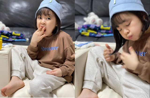 사진 속에는 이윤지의 첫째 딸 라니의 일상 모습이 담겨있다. 소파에 앉아 천혜향을 먹고 있는 라니 양. 이때 입을 크게 벌린 채 먹방에 집중하거나 맛있는 천혜향을 온 몸으로 표현 중인 라니 양의 모습이 귀여움 가득하다.