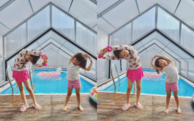사진 속 로희, 로린 자매는 물놀이를 하기 전 열심히 준비운동을 하고 있다. 핑크색 수영복을 입고 깜찍한 자태를 뽐내는 '로로자매'의 귀여운 모습이 보는 이들의 미소를 자아낸다.
