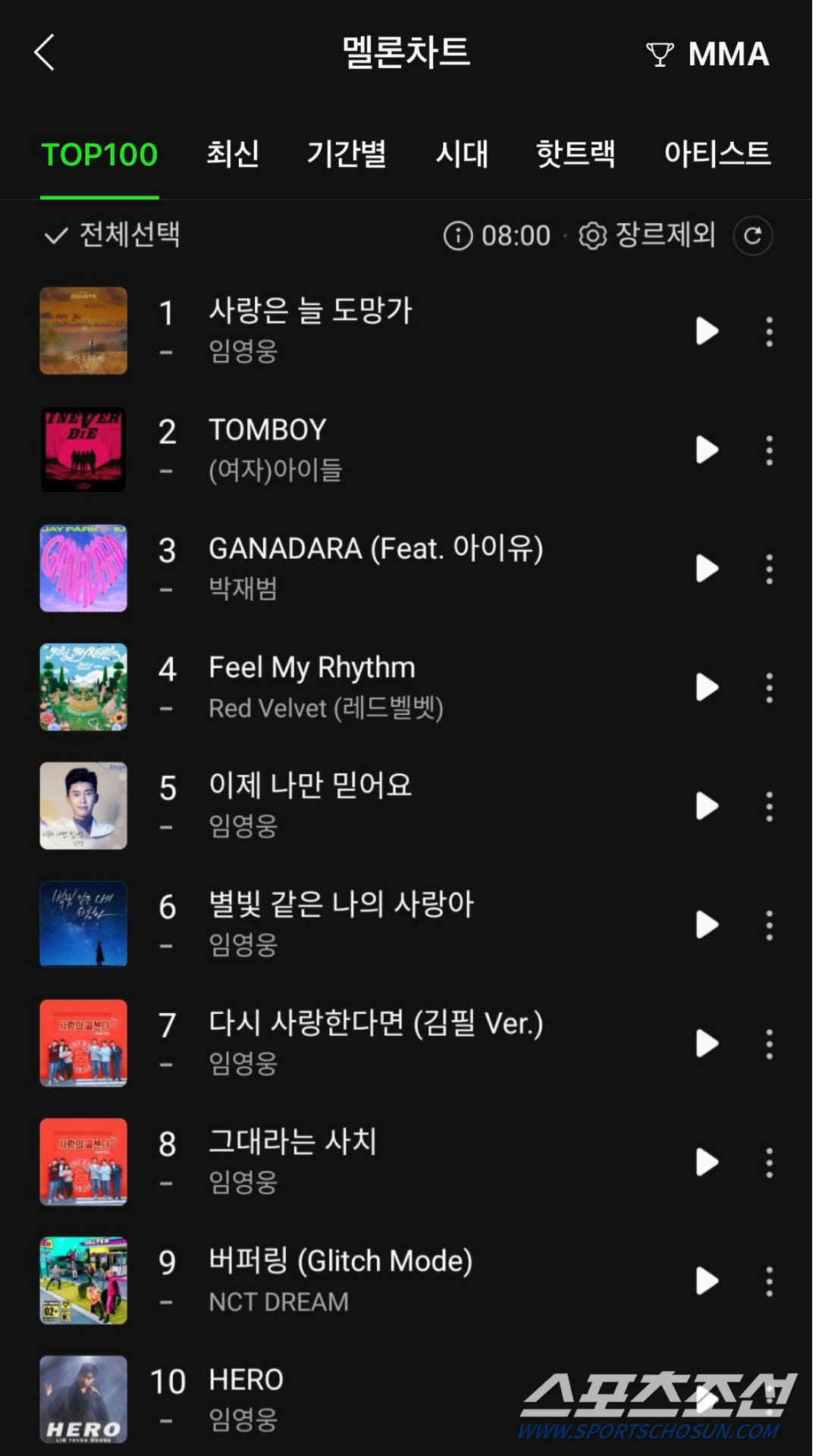[스포츠조선 이정혁 기자] 가수 임영웅이 온라인 음원 사이트 멜론 TOP 10을 점령했다.