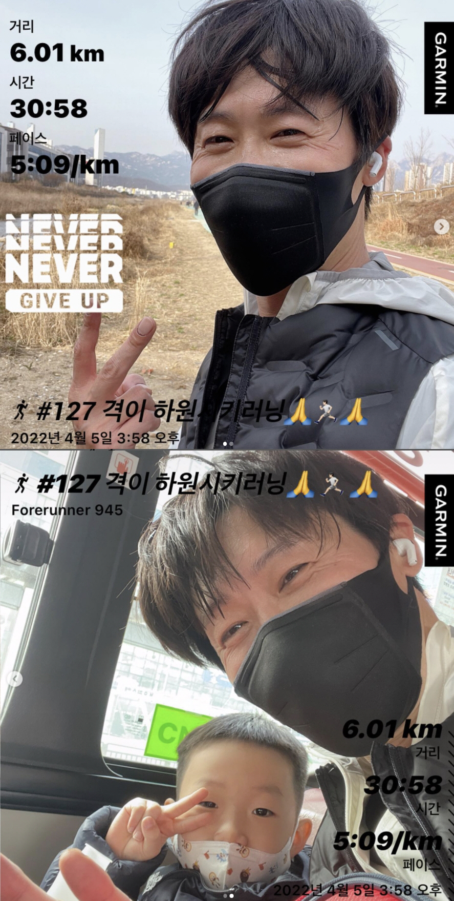 사진과 함께 올린 글에서 그는 '쉴틈없이 촬영만하다가 간만에 그리웠던 집. 격이가 오늘은 버스가 타고 싶다길래 몰래 격이 유치원까지 하원길러닝. 유치원 버스가 아닌 일반버스로 집으로. 간만에 배우가 아니라 아빠라서 참행복했다. 늦을까봐 조금 빨리갔는데 간만에 빡빡했네'라고 밝혔다.
