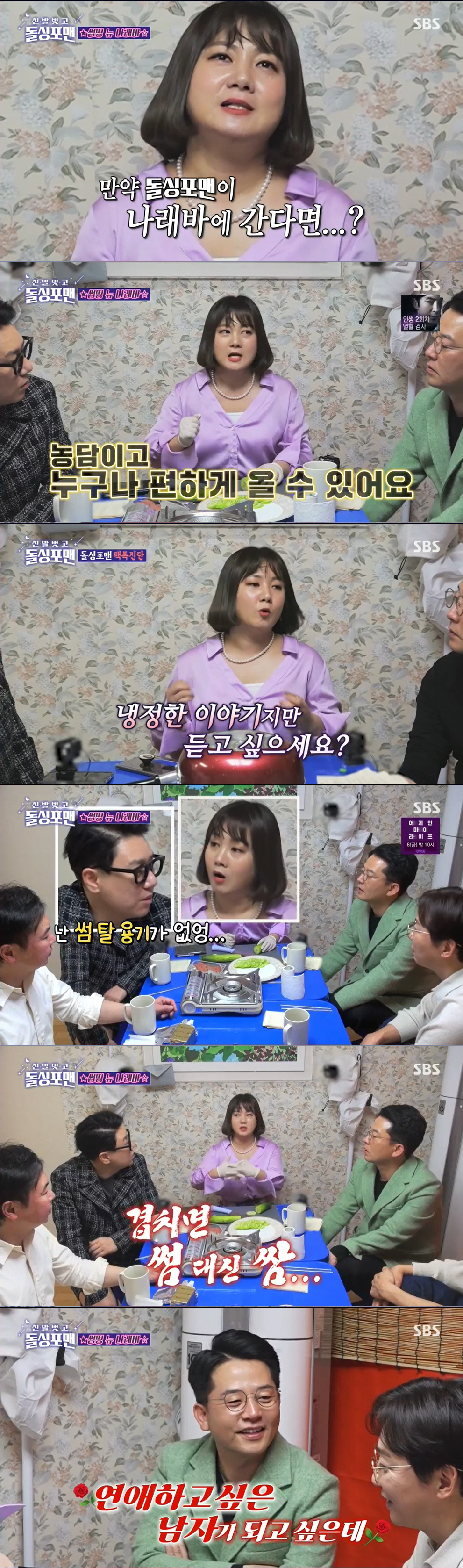 또한 박나래는 멤버들로부터 "왜 결혼을 못하나"라며 안타까운 핀잔을 들었다. 탁재훈은 "진정한 남자를 못만난 거다"라 끄덕였다. 이어 "일단 이중에는 없다"라고 농담했다. 박나래는 "내가 왜 열심히 일하는 줄 아냐. 난 철저하게 남자 얼굴만 본다"라며 너스레를 떨었다.