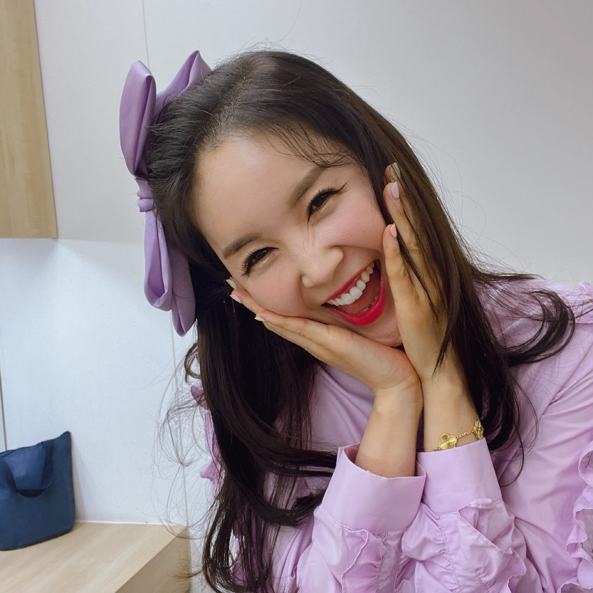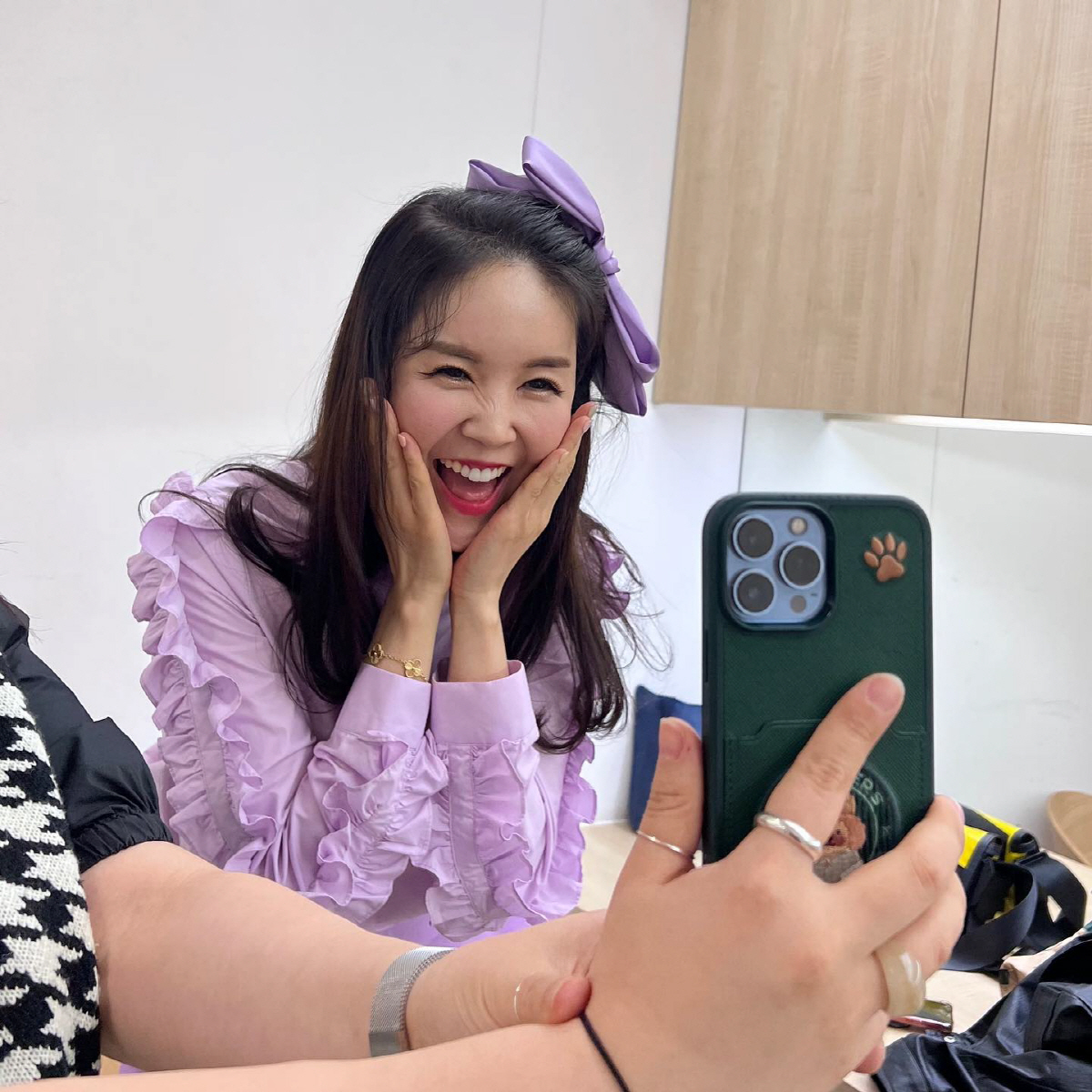 사진 속에는 대기실로 보이는 장소에서 사진을 촬영 중인 장영란의 모습이 담겨있다. 이날의 콘셉트는 보라인 듯 보라색 헤어 머리핀에 블라우스를 착용한 모습. 화사한 봄 느낌이 물씬 풍겼다.