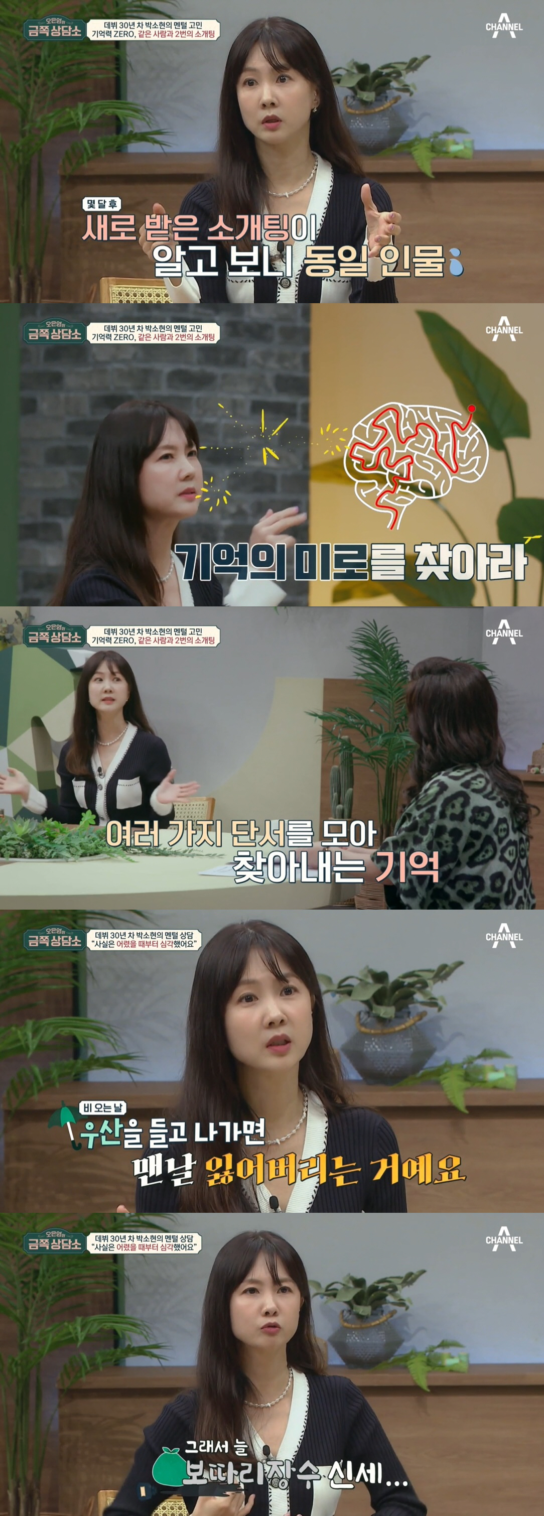 이에 오은영은 "만만한 상황은 아닌 것 같다. 어려움이 있는 것 같다"라고 반응했다. 박소현은 "만난 사람을 기억을 못 하고 일도 기억 못하는 게 반복된다. 제가 이만큼 스트레스 받는다는 걸 사람들은 잘 모를 거다. 처음으로 말씀드리는 것"이라고 전했다.