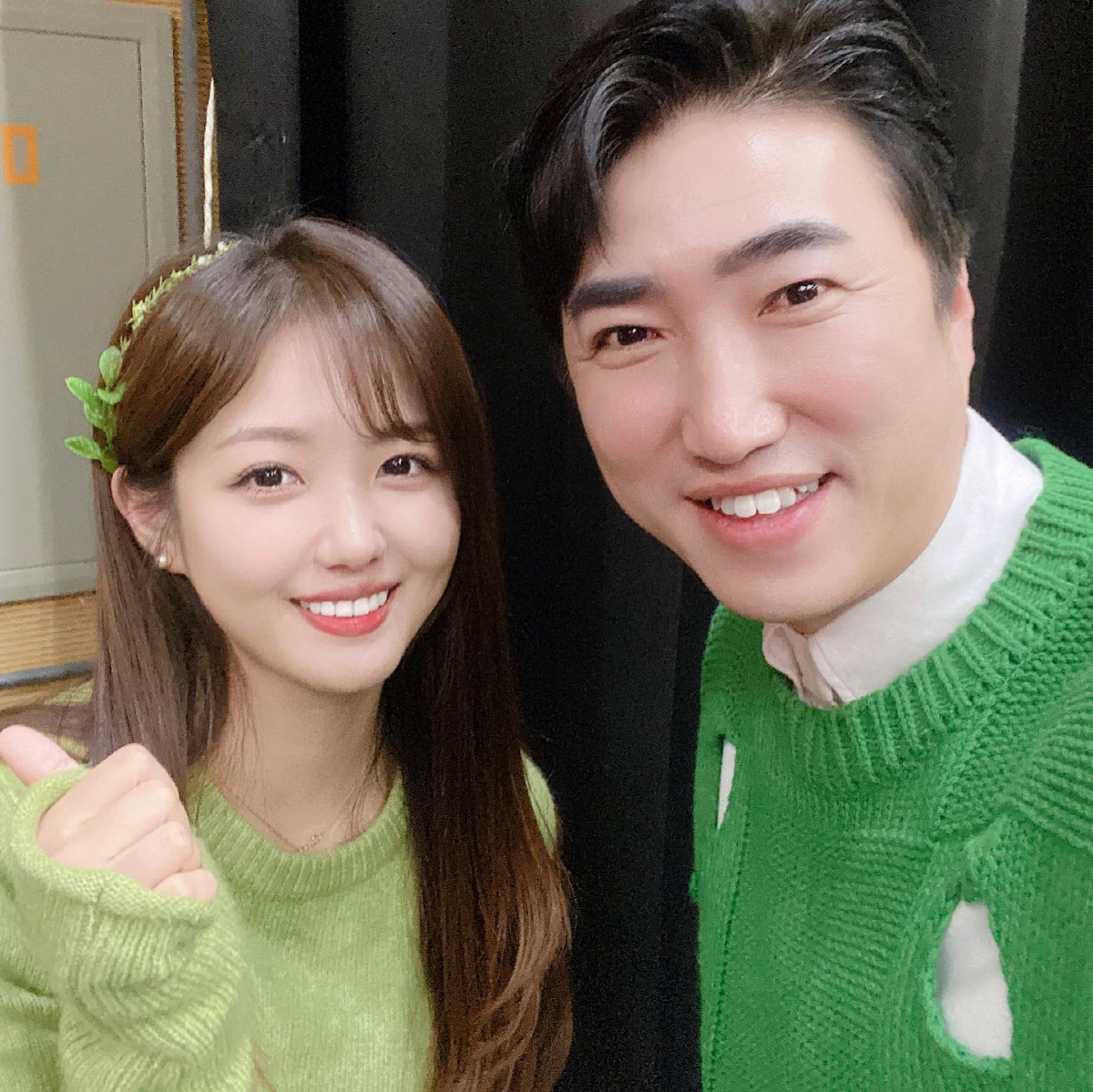 특히 두 사람 모두 초록색 계열의 니트를 입어, 커플룩 같은 스타일링을 자랑하고 있다. 이들은 MBC 예능 프로그램 '복면가왕' 촬영장에서 만나, 해당 사진을 찍은 것으로 보인다.