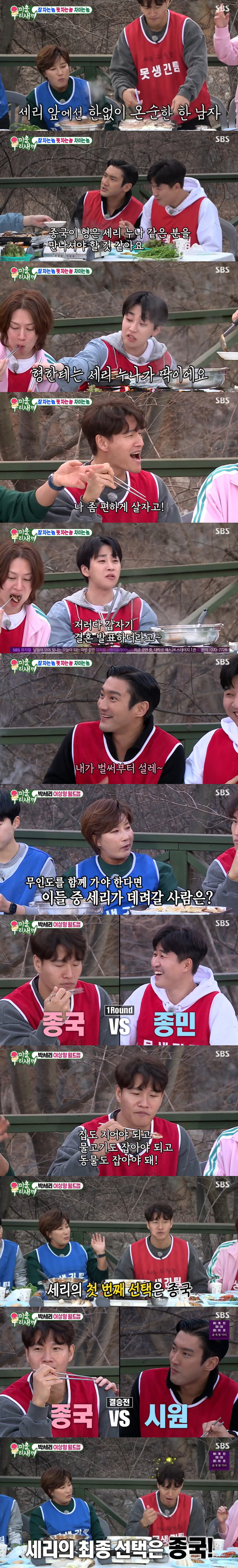 이후 박세리의 이상형 월드컵에 진행됐다. 박세리에게 김희철은 '무인도를 함께 가야한다면 김종국과 김종민 중 누구를 데리고 갈 것이냐'고 질문했다. 이에 박세리는 김종국을 꼽으며 "힘이 좋아서 일을 잘 할 것 같다"고 말했다. 이어 김종국과 최시원 가운데서도 김종국을 꼽은 박세리는 "(김종국은)뭐든 다 할 사람이니까. 생활력이 강하니까"라고 김종국을 선택한 이유를 밝혀 눈길을 끌었다.