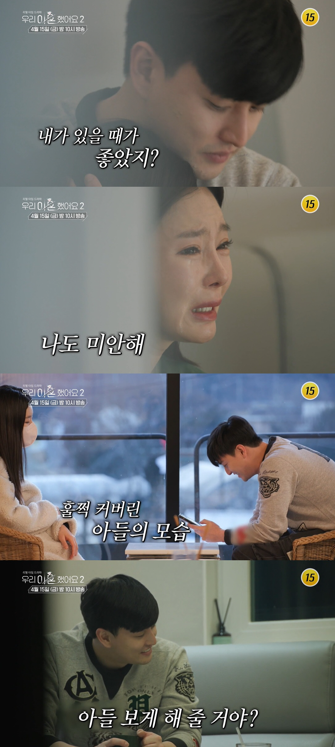 지난 회 방송에서는 마음속 응어리를 꺼내며 살벌한 분위기를 만들었던 두 사람이 확 바뀐 온도차를 보여 재결합을 기대하게 했다.