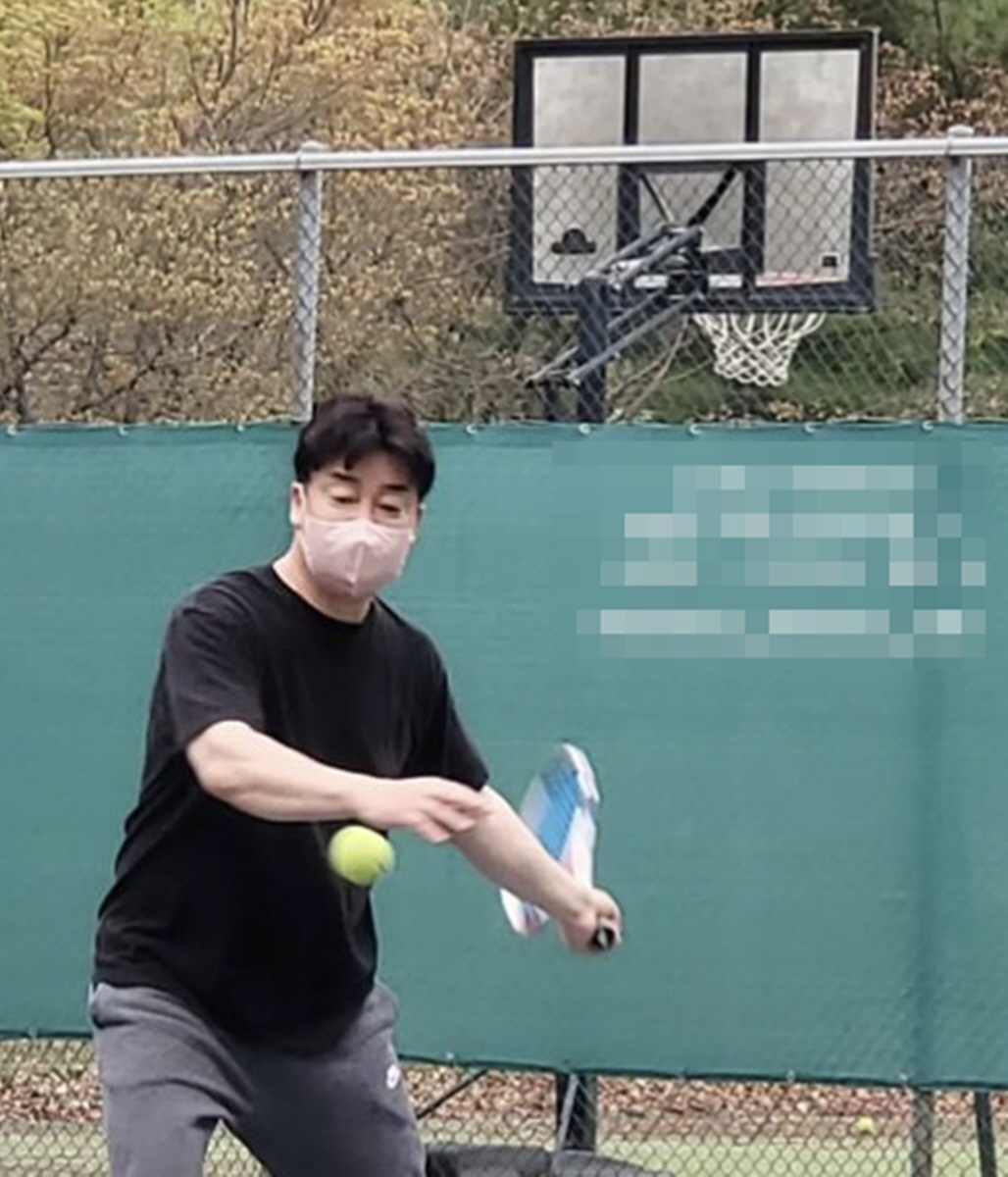 사진에는 테니스를 열심히 치고 있는 백종원의 모습이 담겼다.