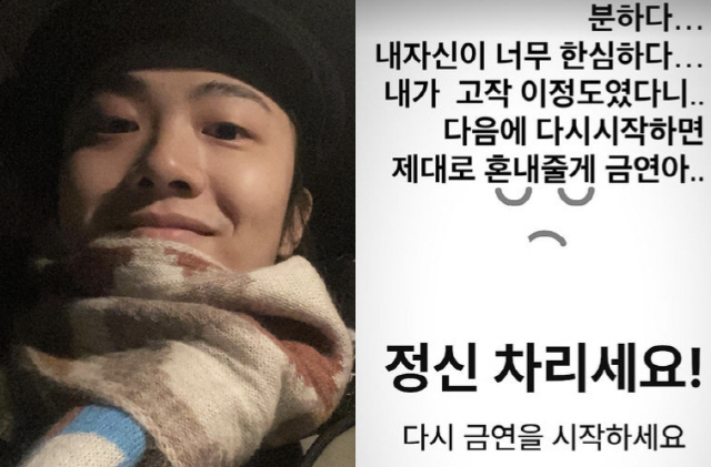 기리보이는 13일 자신의 인스타그램 스토리에 "분하다... 내 자신이 너무 한심하다. 내가 고작 이정도였다니... 다음에 다시 시작하면 제대로 혼내줄게 금연아... 정신 차리세요! 다시 금연을 시작하세요"라며 사진을 게재했다.