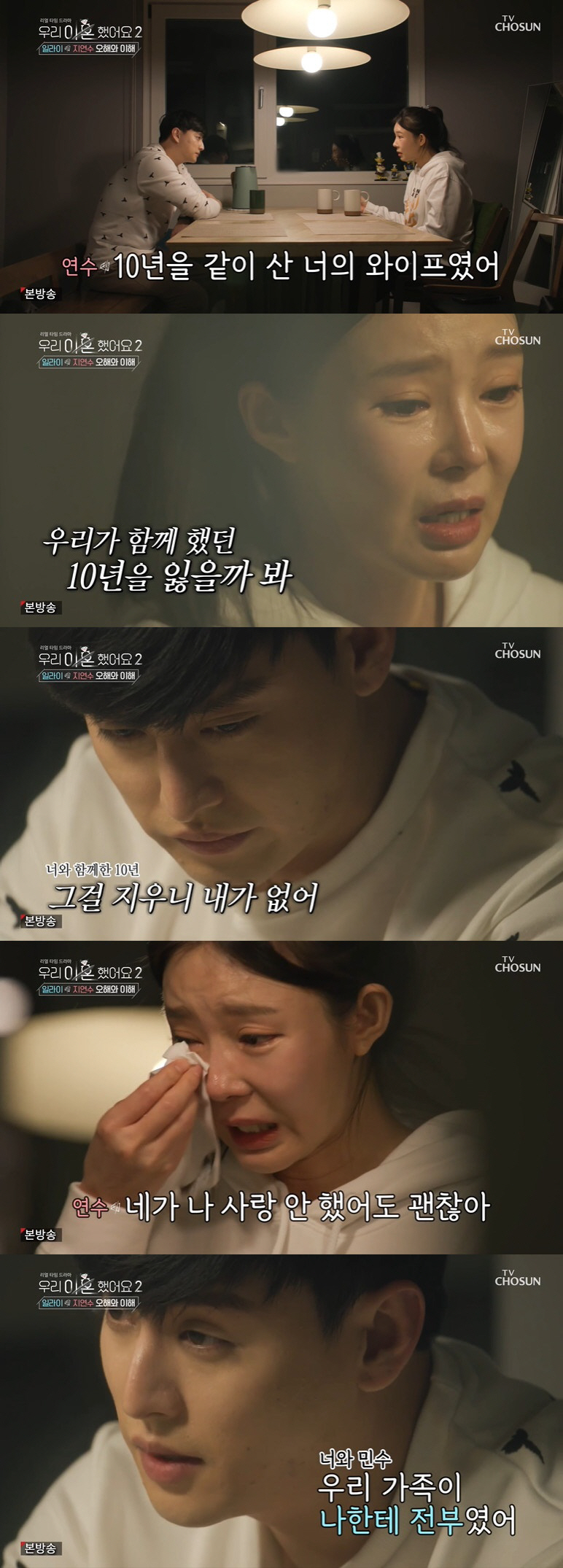 지연수는 "힘들었던 시간을 지우고 나를 찾아야 하는데 그 10년에 다 네가 있더라. 그걸 다 지우니까 내가 없다. 그래서 하나도 안 지우고 그냥 뒀다. 네가 나 사랑 안 했어도 괜찮다. 내가 사랑했으니까"라며 오열했고 일라이는 "나도 사랑했다"고 말했다.