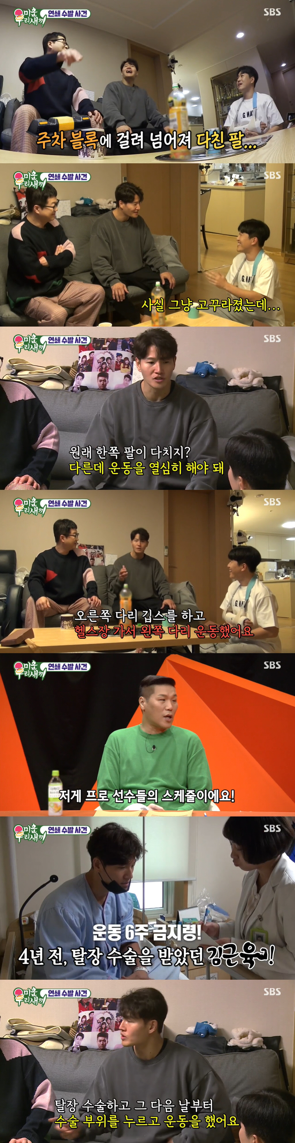 이에 김종국은 "한쪽 팔을 다치면 다른데 운동을 열심히 해야 한다"며 "내가 못하는 걸 남에게 강요하지 않는다. 나는 오른쪽 다리 깁스를 하고 헬스장에서 왼쪽 다리 운동을 했다"고 말해 김종민을 당황하게 했다. 이를 듣던 서장훈은 "프로 선수들의 스케줄이다. 김종국이 진심으로 운동한다는 거다. 프로 선수들이 다쳤다고 쉬지 않고 안 다친 부위를 운동한다"고 했다.