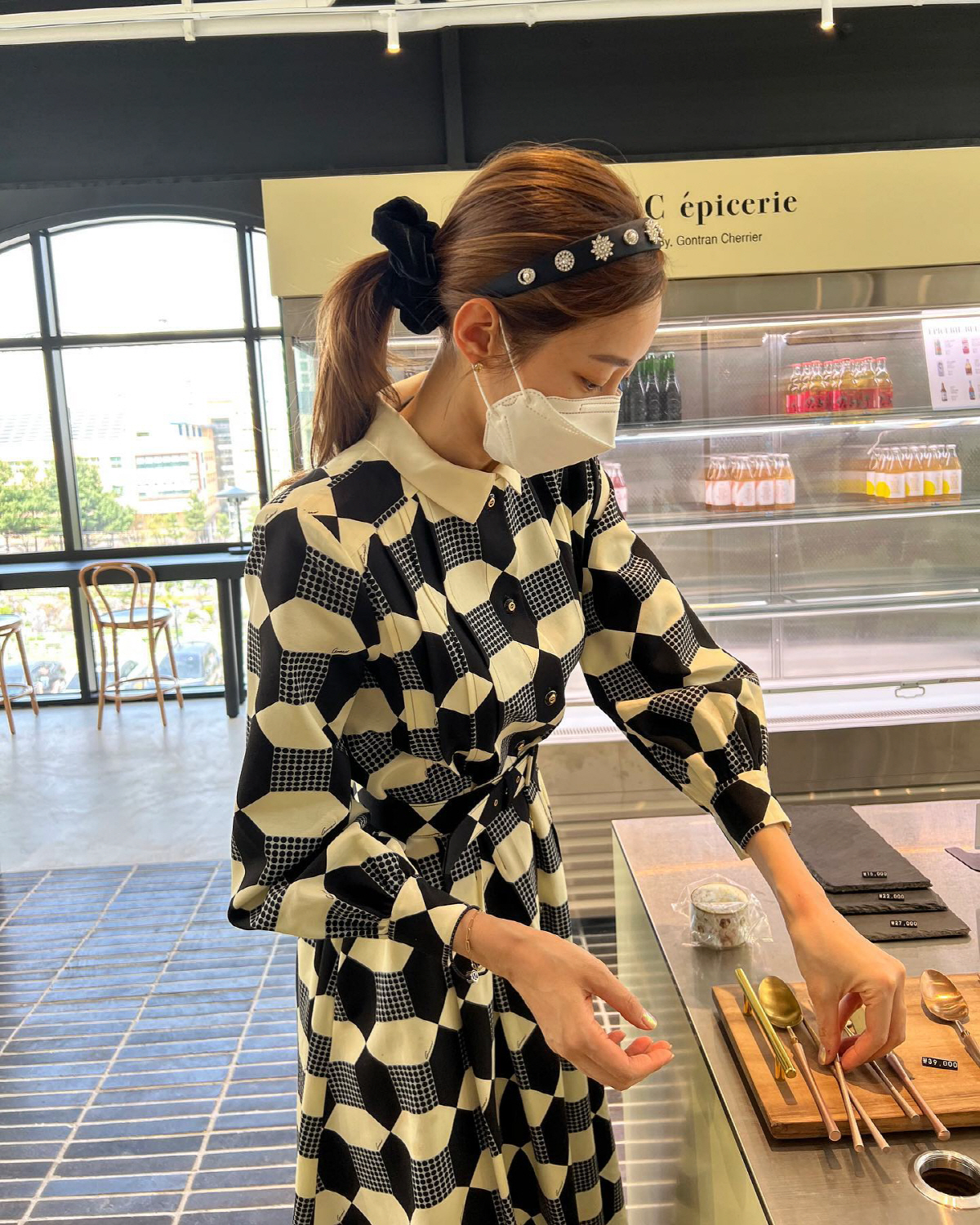 또 다른 사진에는 식기를 보고 있는 서하얀의 모습이 담겼다. 화려한 무늬의 원피스를 입은 그는 머리띠와 벨벳 소재의 스크런치로 헤어 스타일링에 포인트를 줬다.