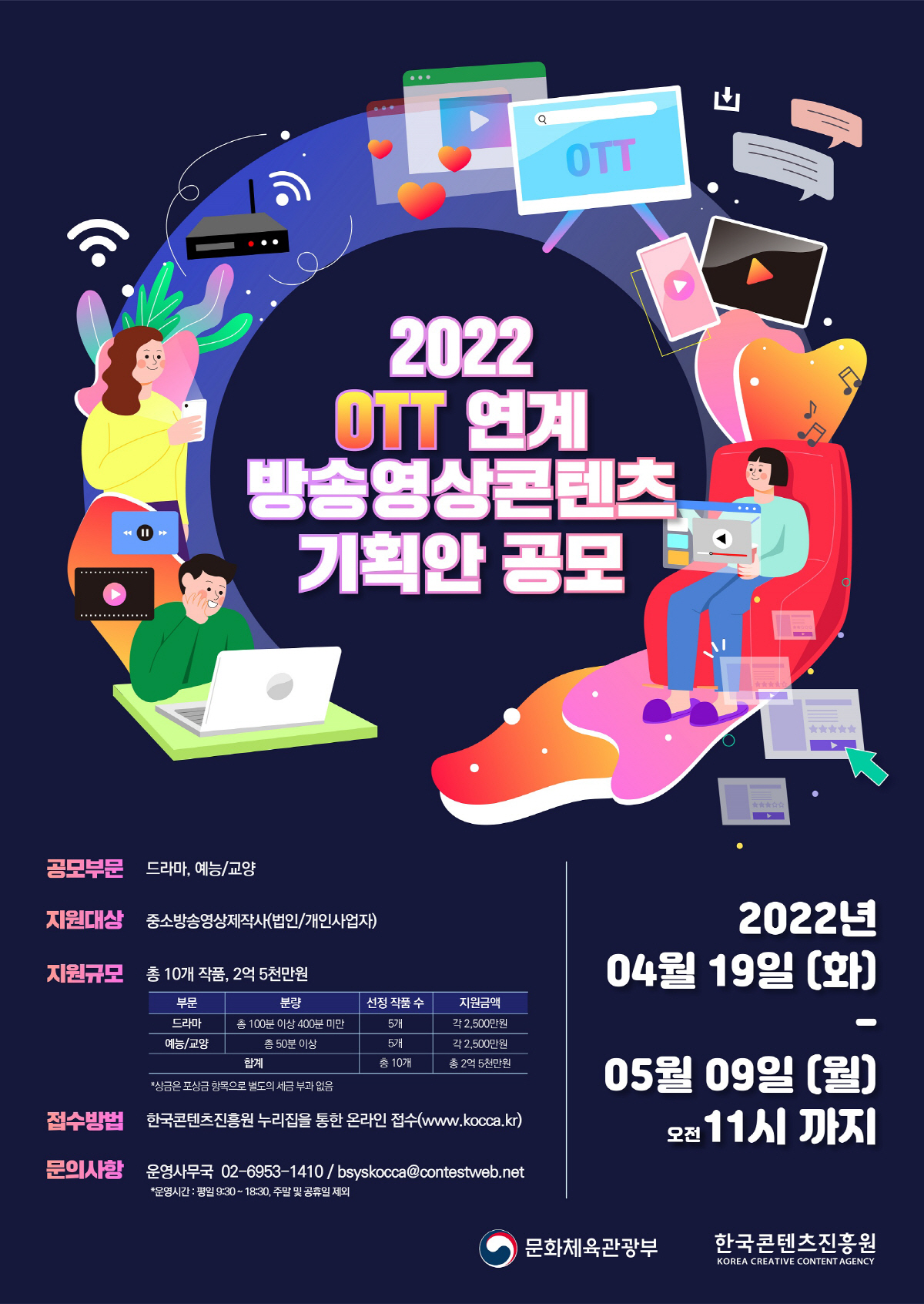 '2022년 OTT 연계 방송영상콘텐츠 기획안 공모'를 오는 5월 9일까지 진행한다.