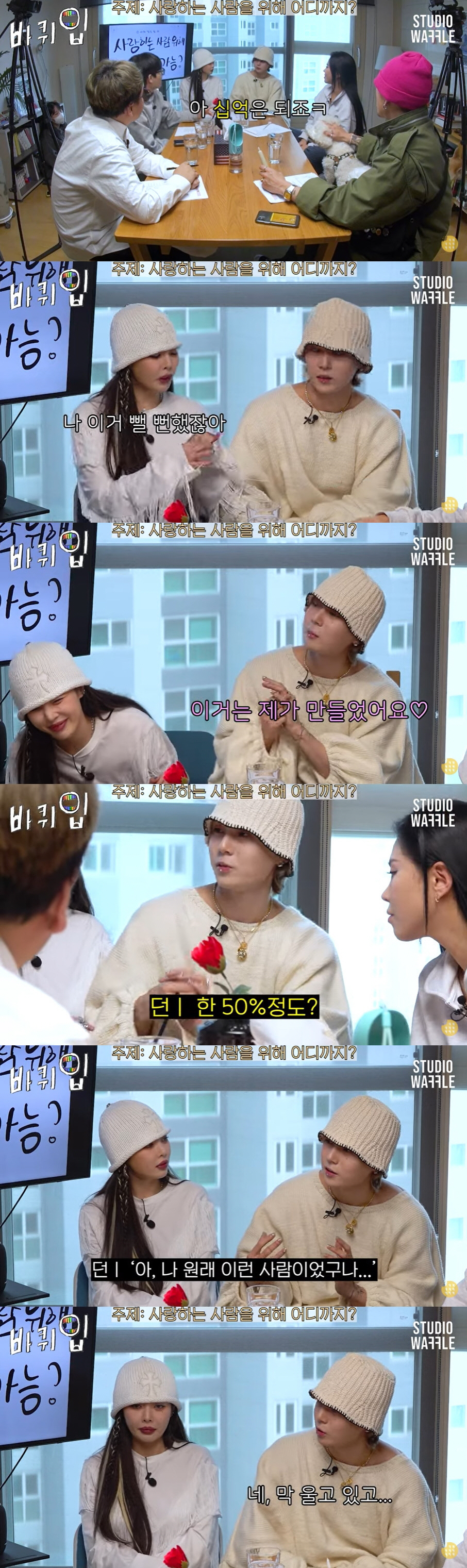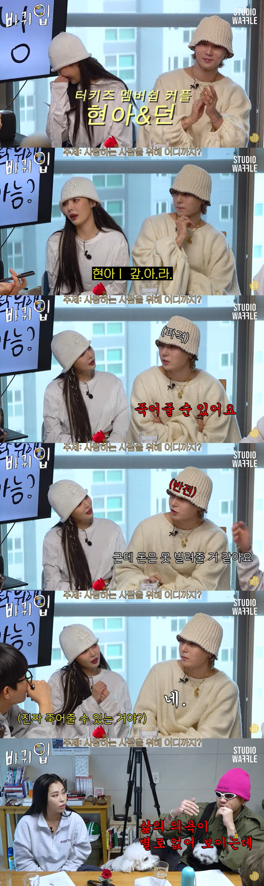 현아는 "던이 재산의 80% 빌려달라고 하면 빌려줄 수 있느냐"는 물음에 "대신 계약서를 쓸 것 같다. 근데 무조건 갚아라. 갚을 능력이 되면 빌려가. 하지만 그게 안 될 거라면 빌려가지마"라고 솔직하게 말했다. 이어 던은 "죽어 줄 순 있다"면서도 "근데 돈은 못 빌려줄 것 같다"고 했다. 그는 "죽으면 후회 할 수가 없다. 그런데 다른 거 해줬을 때 내가 후회하면 그게 더 슬플 것 같다"고 해 현아를 감동하게 했다.