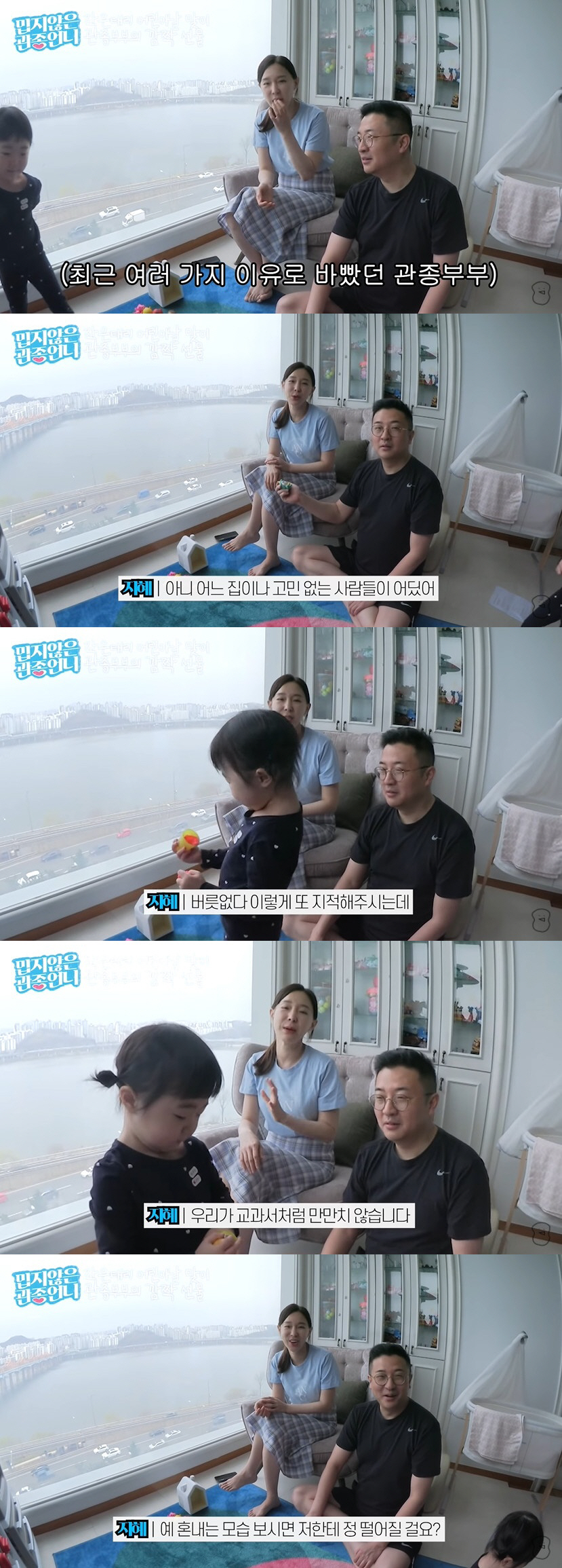 이지혜는 "라디오도하고 집 알아보느라 부동산도 돌아다니느라 피곤하고 힘들다"며 "우리 그래도 열심히 한다. 어느 집이나 고민 없는 사람이 어디 있겠냐"고 밝혔다. 이어 "댓글 보면 태리 버릇없다고 지적하시는데 애들 키우는 게 교과서처럼 만만치 않다. 아이를 혼낼 때는 혼낸다. 혼내는 모습 보면 저에게 정떨어질 거다. 눈물 쪽 빼놓는 스타일이기 때문이다. 여러분들을 위해서 공개하지 않는다. 공개하면 우리 구독자 다시 제로 된다"고 강조했다.