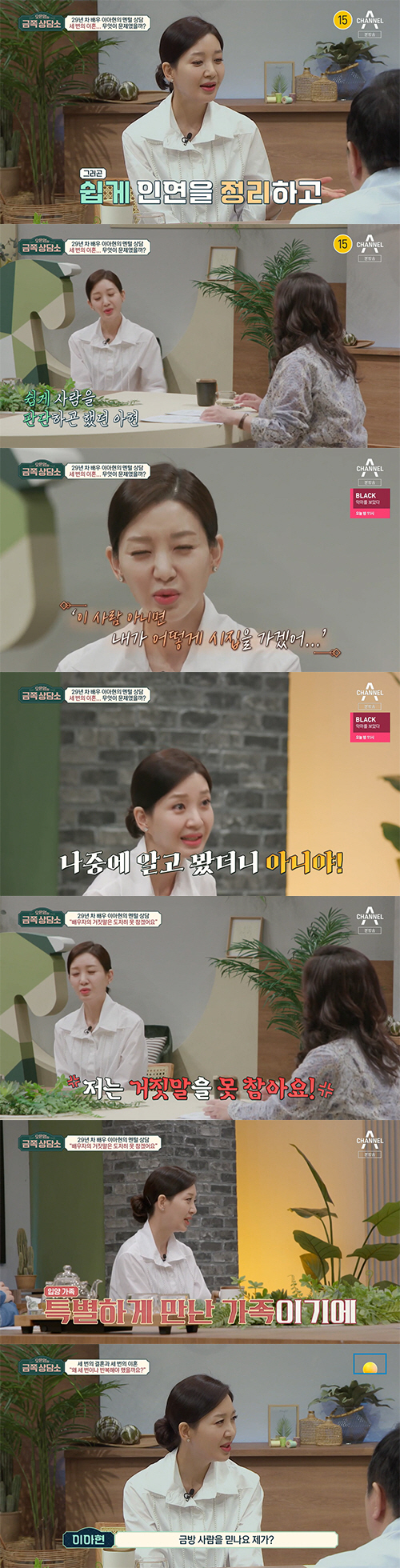 이아현은 "누군가가 다가오면 '이 사람이 아니면 내가 어떻게 시집을 가겠어'라고 생각했다. 근데 부모님은 '좀 더 만나봐라'라고 했지만 난 그렇지 않았고, 나중에 보면 '그런 사람'이었다"라고 이야기했다.