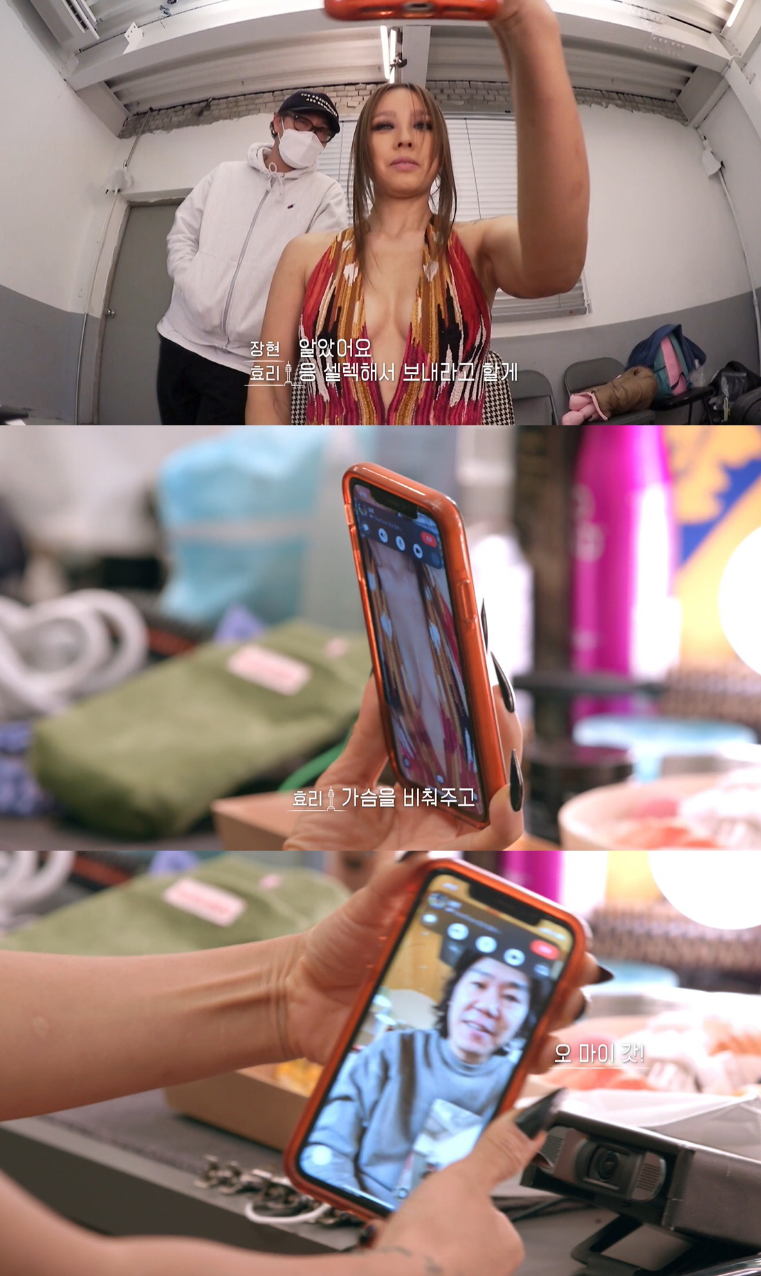 22일 오후 공개된 티빙 오리지널 '서울체크인'에서 이효리는 새로운 의상을 입고 대기하던 중 "벗은 거 입었을 때 영상전화 시도. 가슴을 비춰주고"라며 남편 이상순에게 영상통화를 시도했다.