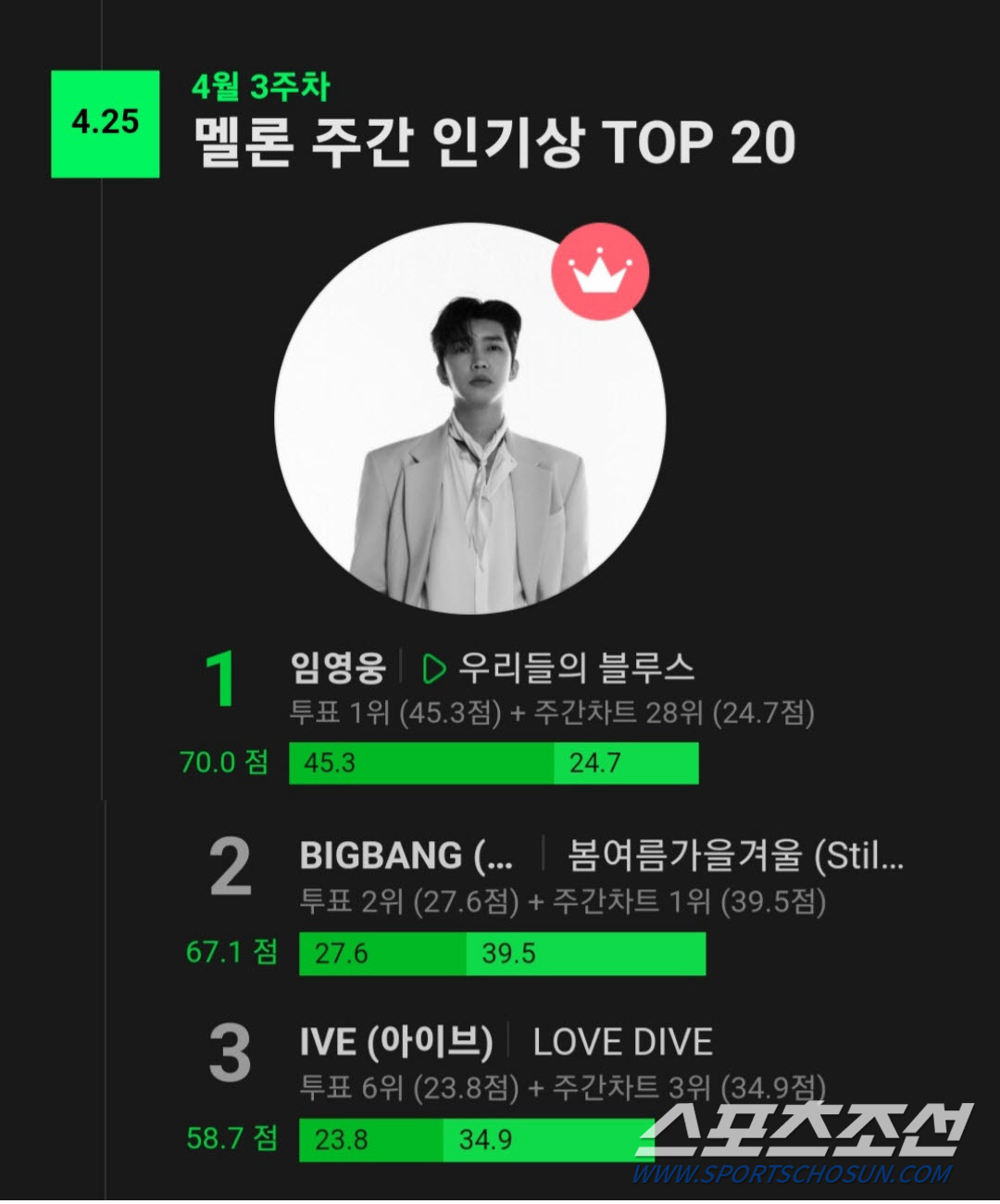 [스포츠조선 이정혁 기자] 가수 임영웅이 멜론 주간 인기상에서 TOP 1을 차지했다.