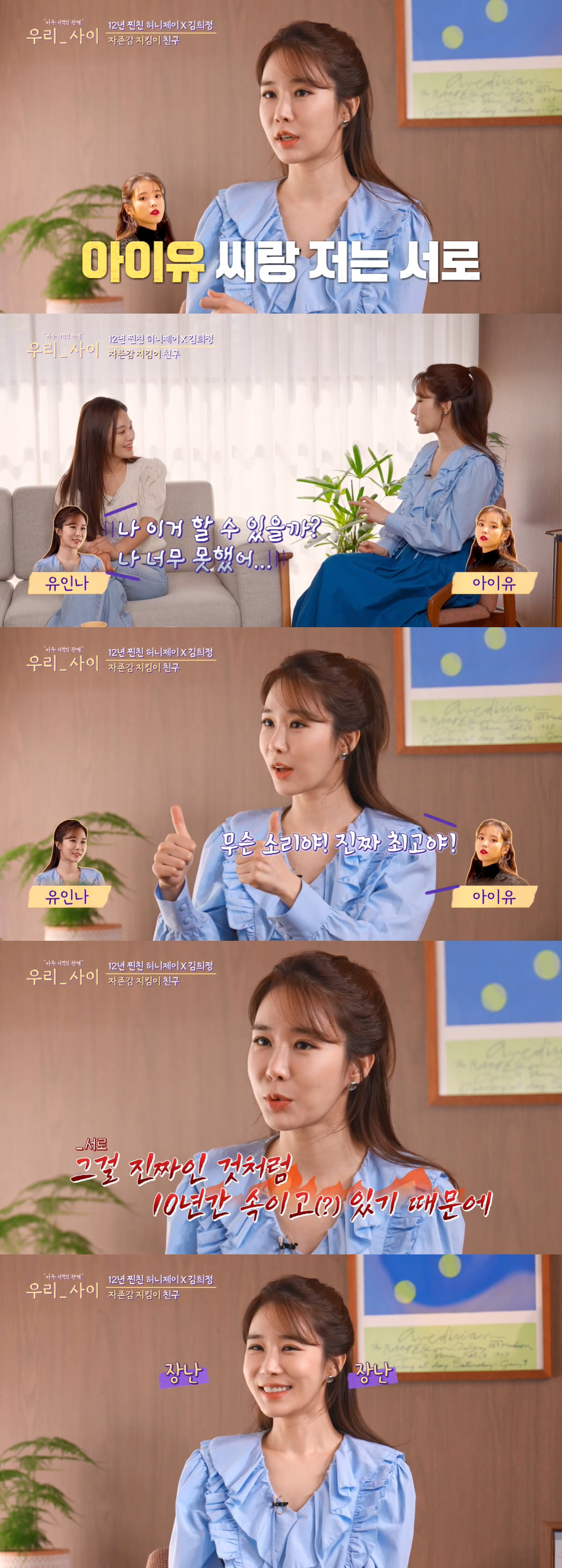 이에 유인나는 "아이유 씨와는 10년 동안 '나 이거 할 수 있을까? 나 너무 못했어'라고 해도 '무슨 소리야. 진짜 최고야. 아주 잘했어'라고 한다"고 했다. 이어 그는 "그걸 진짜인 것처럼 10년간 속이고 있다"고 덧붙여 웃음을 유발했다.