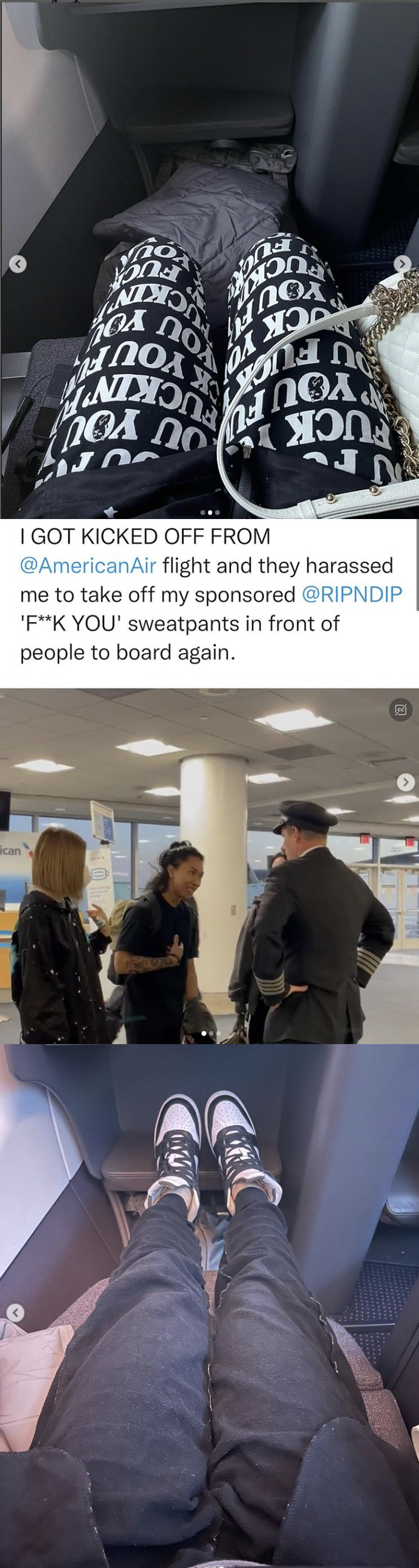 비지니스 1번 좌석에 앉아서 출발직전 웰컴드링크까지 마시고 있었는데 갑자기 어떤 남자 직원이 오더니 이유도 알려주지 않은 채 저에게 다짜고짜 짐을 다 가지고 나가라고 하더니 비행기 입구 앞에서 저의 바지가 "불쾌"하다며 다른 비행기를 타라고 했습니다"라고 주장했다.