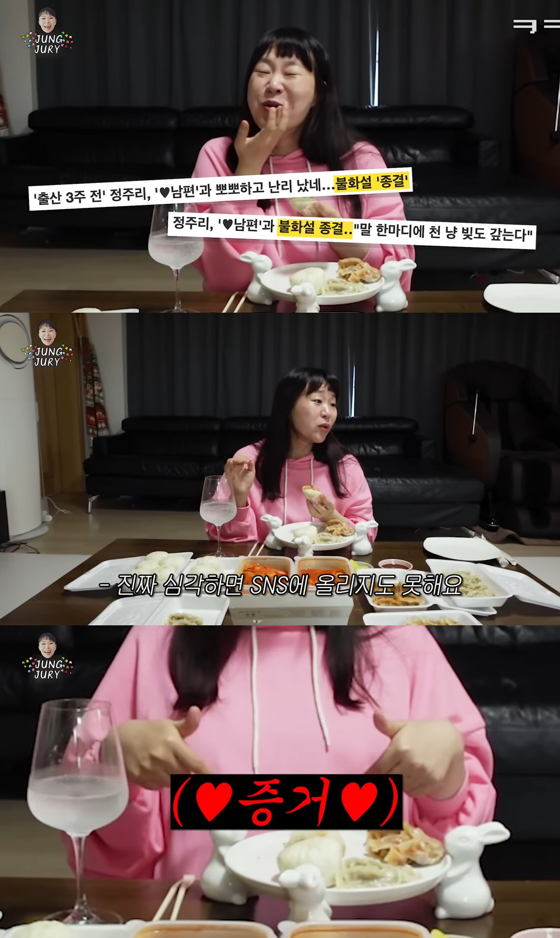 앞서 SNS에 남편과 티격태격 케미를 보였던 정주리는 "요즘엔 남편이랑 화기애애한 사진을 올렸더니 불화설 종결이라는 기사가 떴다"라며 웃음을 터뜨렸다. "우리가 불화설이 있었나 보다. 부부가 사이좋을 때도 있고 아닐 때도 있는데 남들은 우리가 헤어질까봐 걱정이 많이 되나보다"라며 실소했다.