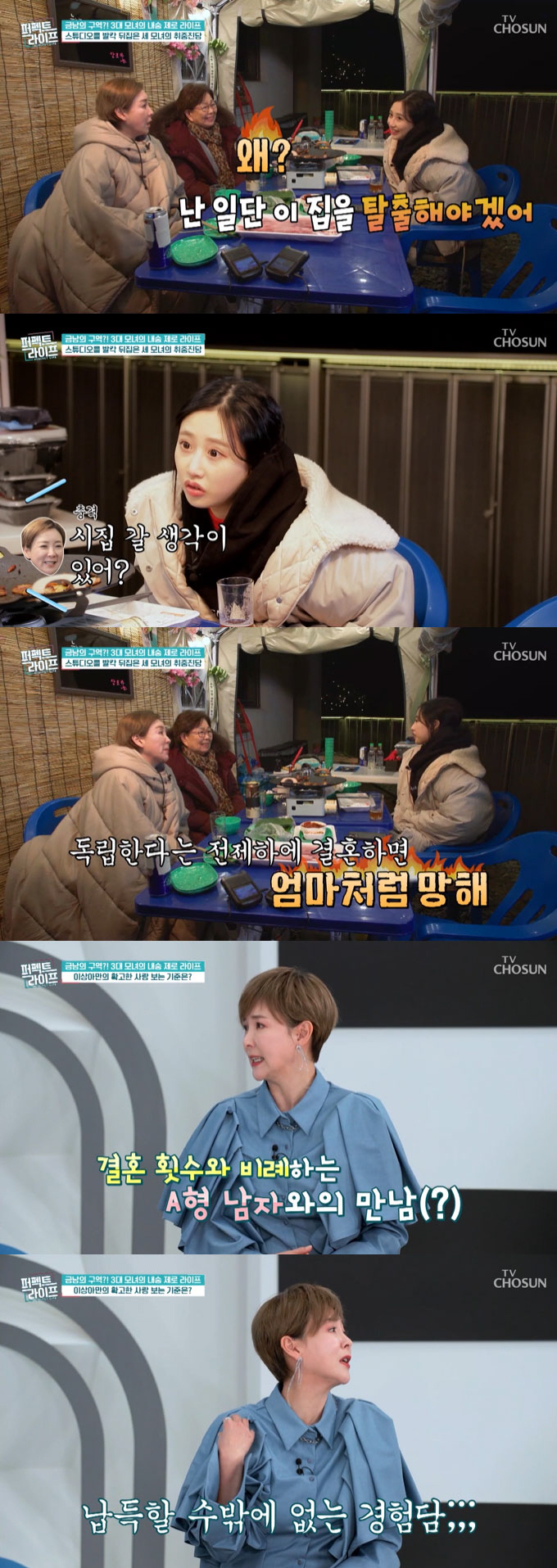 이상아는 딸에게 결혼 언제 할 거냐고 직접적으로 물었다. 딸은 "스물여덟 정도로 생각하고 있다. 일단 난 이 집을 탈출해야겠다. 여자들끼리 사는 거 너무 힘들다. 그리고 도시로 가고 싶다"고 솔직한 마음을 털어놨다. 이를 들은 이상아는 "독립한다는 전제 하에 결혼하면 엄마처럼 망한다"고 조언했다.
