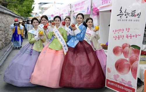 전북 남원시 홍보대사로 위촉된 전국춘향선발대회 입상자들이 6일 춘향제 행사장에서 남원 농특산물을 홍보하고 있다.