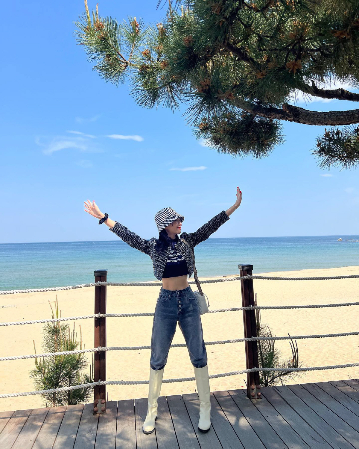 정혜성은 9일 자신의 SNS를 통해 "야호"라는 글과 함께 여러 장의 사진을 게재했다. 공개된 사진 속에는 해변에 있는 정혜성의 모습이 담겼다. 버킷햇에 롱부츠로 패셔너블하게 꾸민 정혜성은 짧은 크롭티로 잘록한 허리를 드러냈다. 키 168cm에 48kg로 알려진 정혜성은 바지도 헐렁하게 남을 정도로 얇은 허리를 드러내 눈길을 모은다. 정혜성의 힙한 패션센스도 돋보인다.