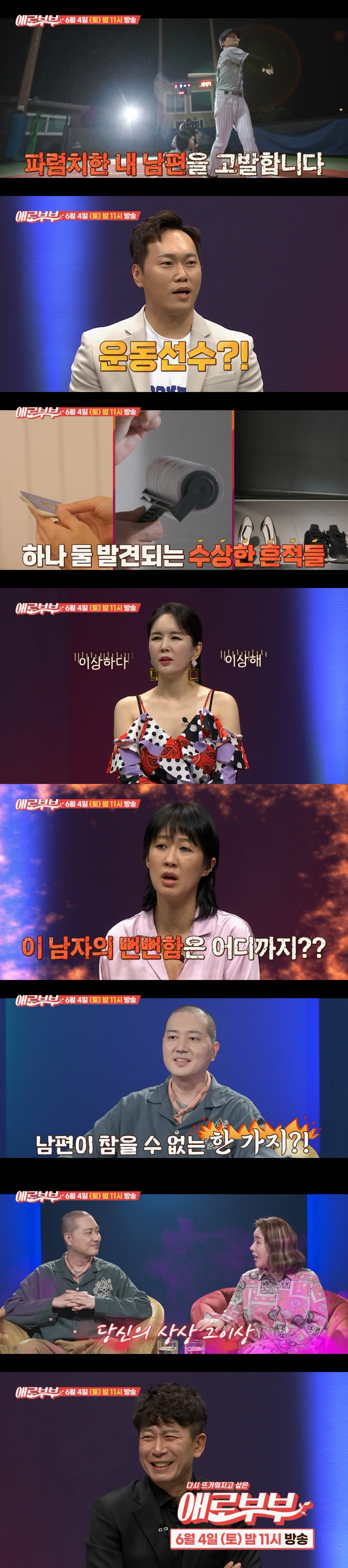 4일 방송되는 ENA채널과 채널A가 공동 제작하는 본격 19금 부부 토크쇼 '다시 뜨거워지고 싶은 애로부부(이하 애로부부)'의 예고편에는 "이 남자의 파렴치한 민낯을 낱낱이 고발하려 한다"라는 아내의 폭로와 함께 운동선수 남편의 모습이 담겼다. 아내는 남편에게서 수상한 불륜의 흔적들을 하나씩 발견했고, MC 장영란도 "뭔가 이상하다"며 의심 가득한 눈빛으로 지켜봤다.