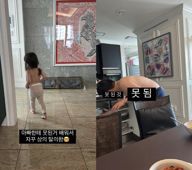 최선정은 2일 자신의 인스타그램 스토리를 통해 "아빠한테 못된 거 배워서 자꾸 상의 탈의함"이라면서 사진을 게재했다.