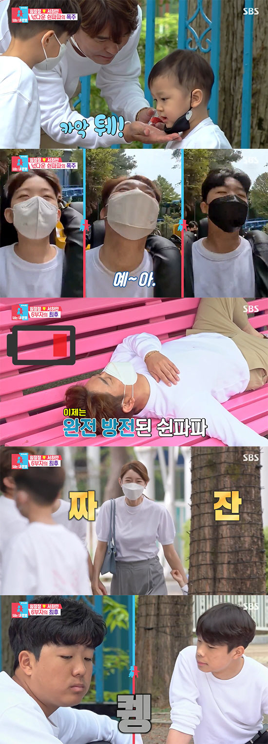 특히 막내는 땅에 떨어진 음식을 주워 먹고, 길가의 쓰레기통을 뒤지며 임창정을 잠시도 가만 두지 않았다. 하지만 '쉰파파'에게는 든든한 첫째, 둘째가 있었다. 임창정은 둘째 준성이 덕분에 막내들을 맡기고 롤러코스터를 타기도 했다.