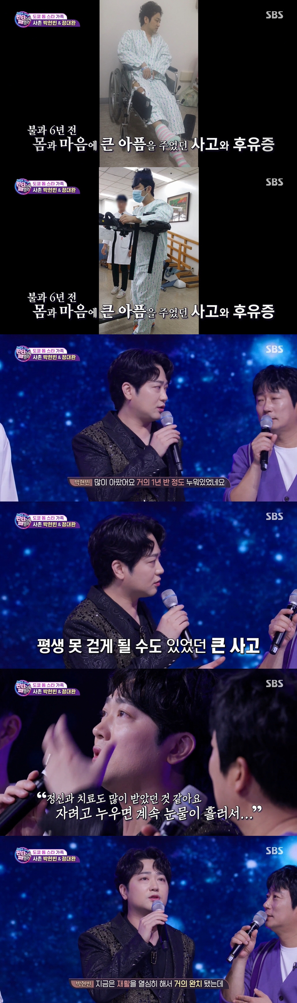 박현빈은 "정신과 치료도 많이 받았다. 자려고 누우면 계속 눈물이 나더라"면서 "그때 트라우마와 후유증이 너무 커서 치료를 많이 받았다. 지금은 재활을 열심히 해서 거의 완치됐다"고 밝혔다.