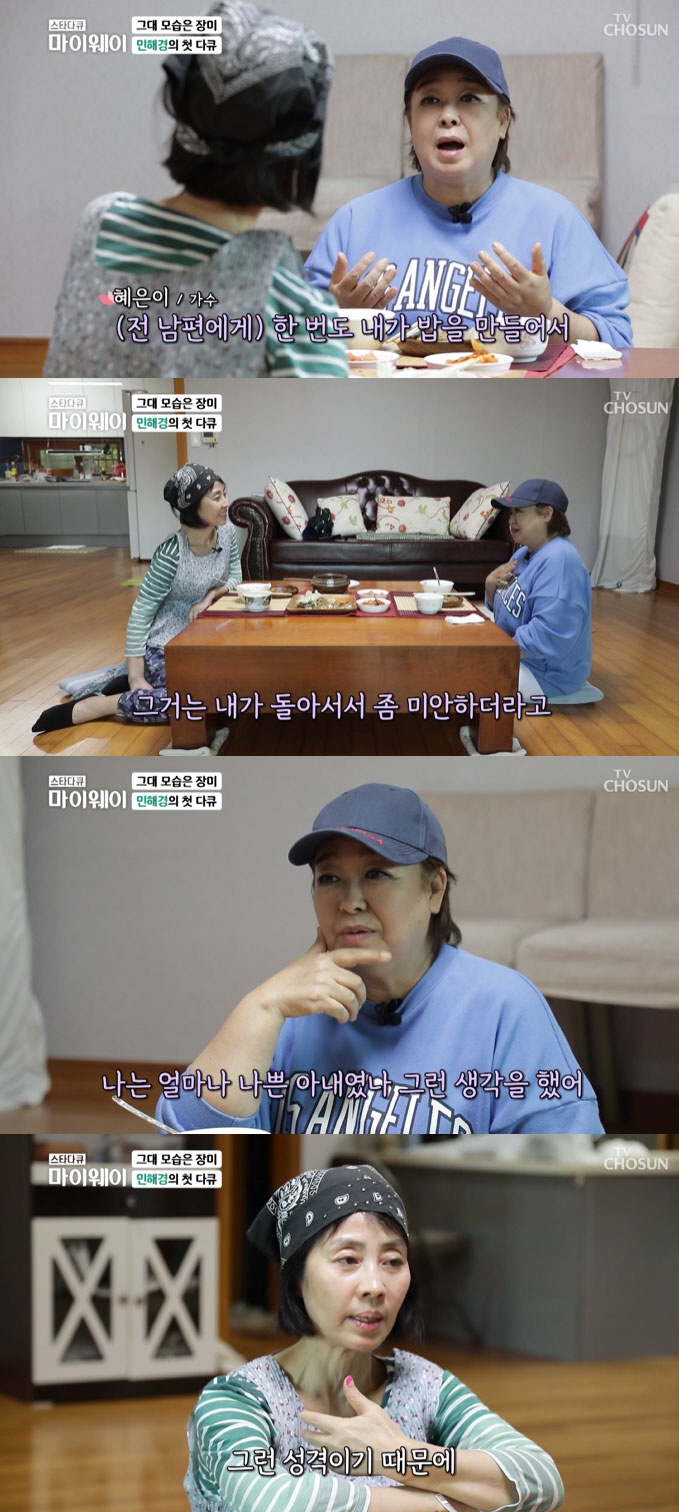 혜은이는 "지난 이야기지만 전남편에게 미안했던 것이 있다. 한 번도 밥을 차려서 준 적이 없었다. 미안했다. 내가 얼마나 나쁜 아내였나 그런 생각을 했다"고 과거를 떠올렸다. 이에 민해경은 "나는 내가 해야 하는 성격이기 때문에 내가 할 수 있었던 거다"라며 성격의 차이일 뿐 혜은이는 잘못이 없다고 위로했다.