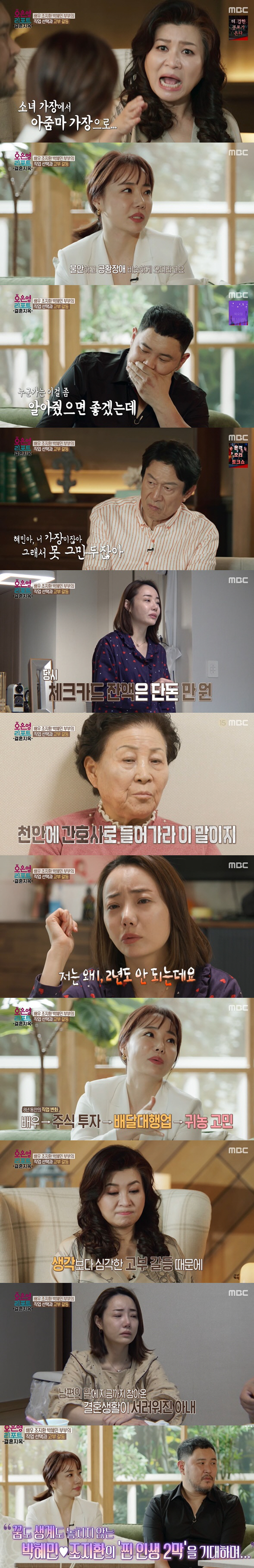 꿈과 현실 사이에서 위기를 맞은 두 사람은 계속 언성을 높였다. 박혜민이 계속 조지환이 배우로서 잘되길 바라며 다그치듯 말하자, 조지환은 "그럼 나랑 결혼하지 말았어야지"라고까지 말하고 말았다. 이에 박혜민은 "오빠가 맨날 '나 잘 될거니까 조금만 참으라'고 그래놓고선, 갑자기 천안으로 내려간다 그러면 어떡하냐"고 눈물을 보였다. 박혜민은 "결혼할때만 해도 남편이 연기를 했다. 그런데 갑자기 연기가 아닌 주식 투자를 하더라. 그러다 배달을 했는데 4번의 사고가 났다"며 "저도 불안장애가 생겼다. 남편이 성공 못하면 내가 성공해야겠다는 마음이 커지더라. 그런데 이번에는 귀농을 하겠다고 하더라"며 속상한 마음을 털어놨다.