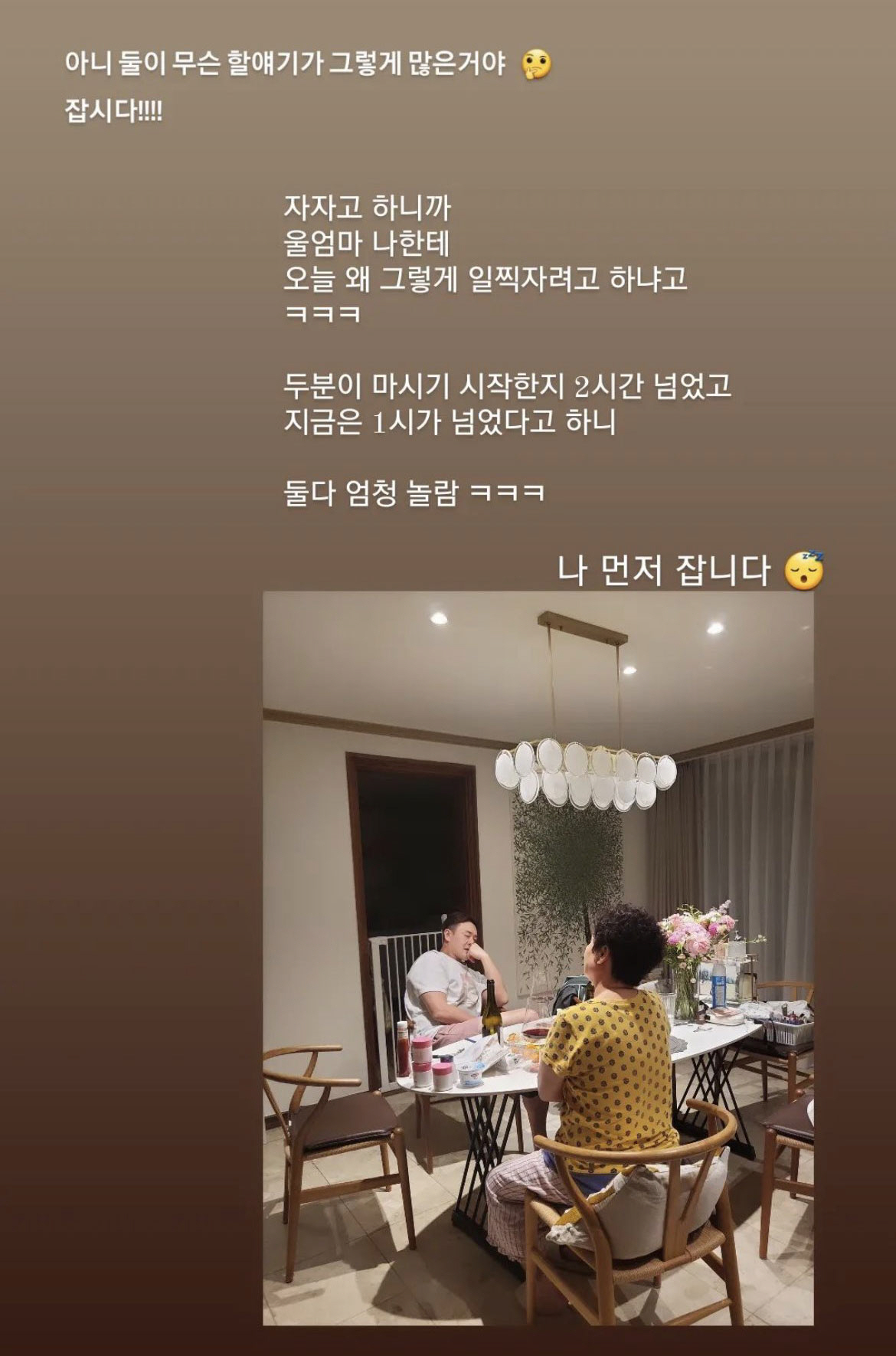 심진화는 "자자고 하니까 울 엄마 나한테 오늘 왜 그렇게 일찍 자려고 하냐고 ㅋㅋㅋ 두 분이 마시기 시작한지 2시간 넘었고 지금은 1시가 넘었다고 하니 둘 다 엄청 놀람 ㅋㅋㅋ 나 먼저 잡니다"라고 상황을 설명하며 김원효의 살가운 모습을 자랑했다.