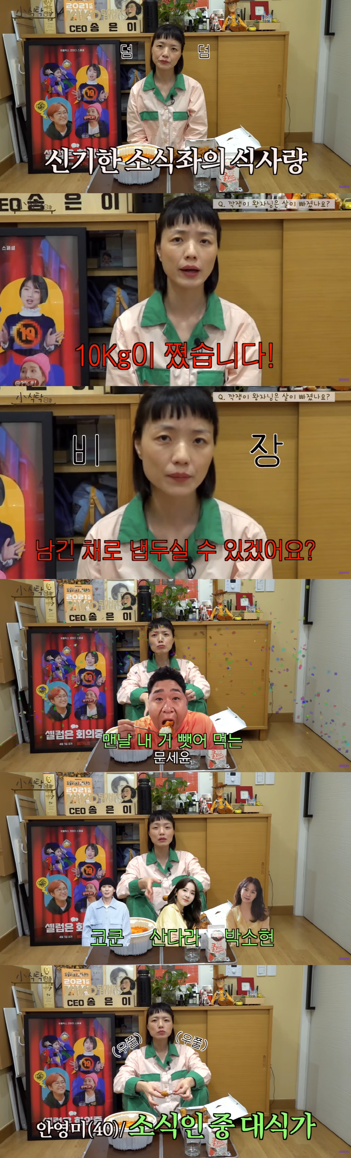 이어 '맨날 내 음식 뺏어먹는 문세윤과 나보다 더 밥 맛없게 먹는 코쿤 중에 남친을 고르라'는 질문에 안영미는 한 치의 망설임도 없이 문세윤을 선택했다. 그는 "내가 이렇게 잘 못 먹으니까 맛있게 잘 먹는 사람 보면 생기 있어 보이고 '진짜 저게 사는 거지' 이런 생각이 든다"며 "코쿤 먹방은 한 번도 본 적이 없다. 그나마 있던 식욕도 떨어질 거 같다"고 밝혀 폭소케 했다. 또 "코쿤, 산다라박, 박소현 사이에서 나는 진짜 대식가다. 난 나름 먹을 때는 또 먹는다"고 주장했다.