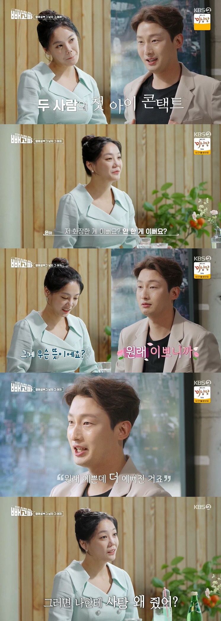 소개팅 장소에 나타난 고은아. 고은아는 민트색 원피스에 올림머리로 단아한 매력을 드러냈다. 고은아는 긴장되는 마음에 김신영에 전화를 걸었고 김신영은 "누구보다 예쁘니까 자신감을 가져라"라고 응원했다.