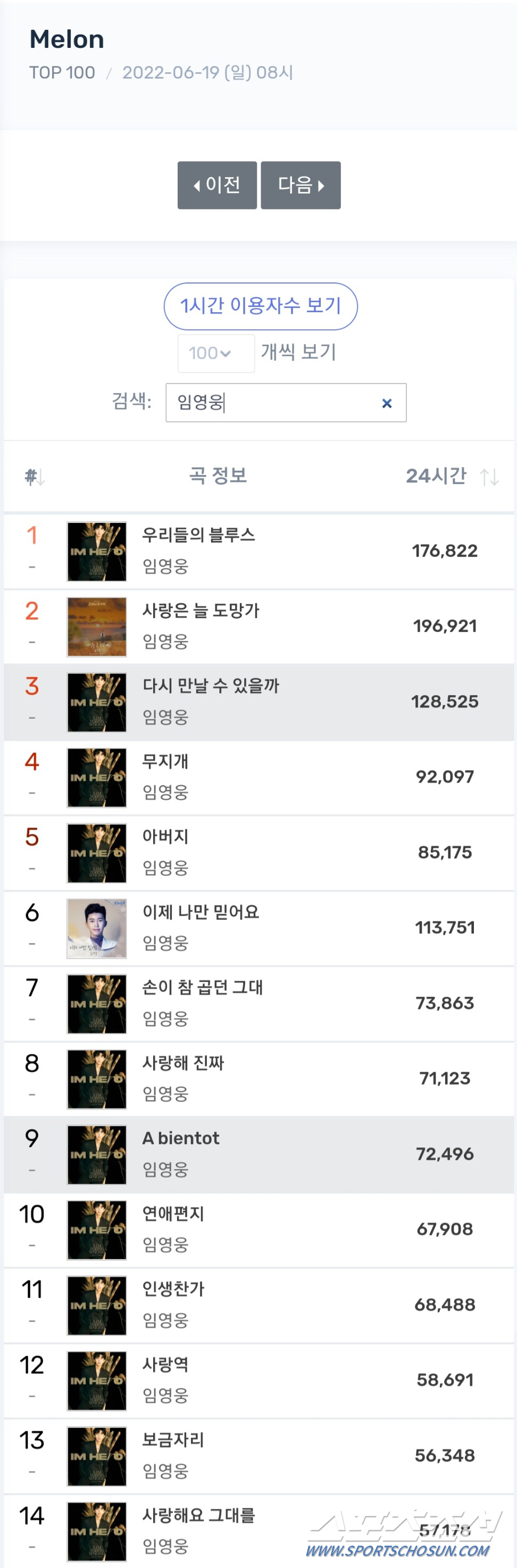 19일 멜론에 따르면 임영웅의 노래 10곡이 TOP 10에 진입, 상위권을 싹쓸이 했고 추가로 11위부터 14위까지도 모두 차지를 했다.