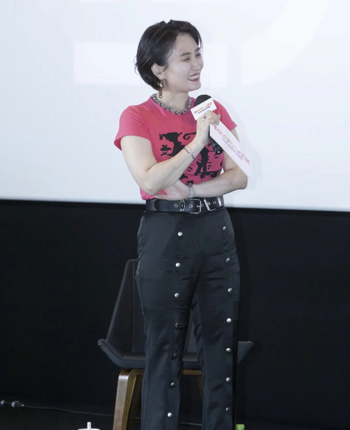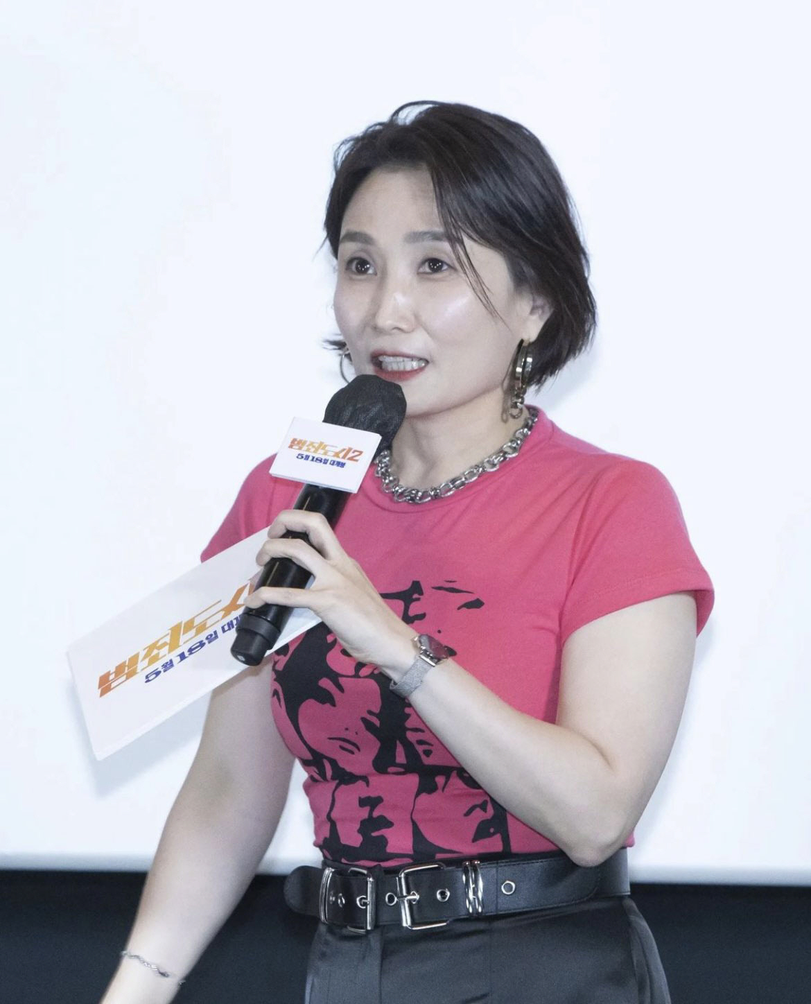 사진에는 영화 '범죄도시2' 제작발표회에서 사회를 보고 있는 박경림의 모습이 담겨있다. 카리스마 넘치는 태도와 자신감 넘치는 표정, 그리고 군살 하나 없는 건강미 넘치는 몸매가 시선을 끈다.