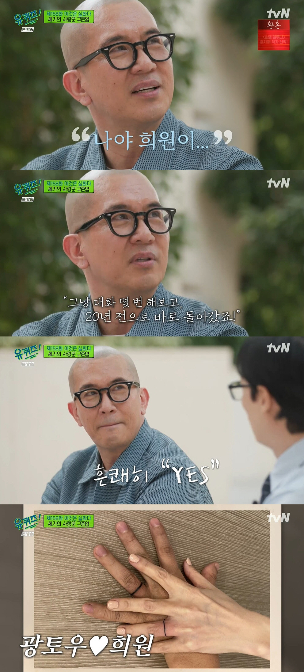 끝으로 영상편지의 기회를 주자 구준엽은 "희원아, 20년 만에 나를 다시 받아줘서 너무 고맙고 앞으로 남은 인생 나랑 재미있게 건강하게 지낼 수 있도록 내가 옆에서 많이 지켜주고 사랑해주고 아껴줄 테니까 같이 즐거운 인생 살았음 좋겠다. 희원아, 사랑한다"고 해 감동을 자아냈다.